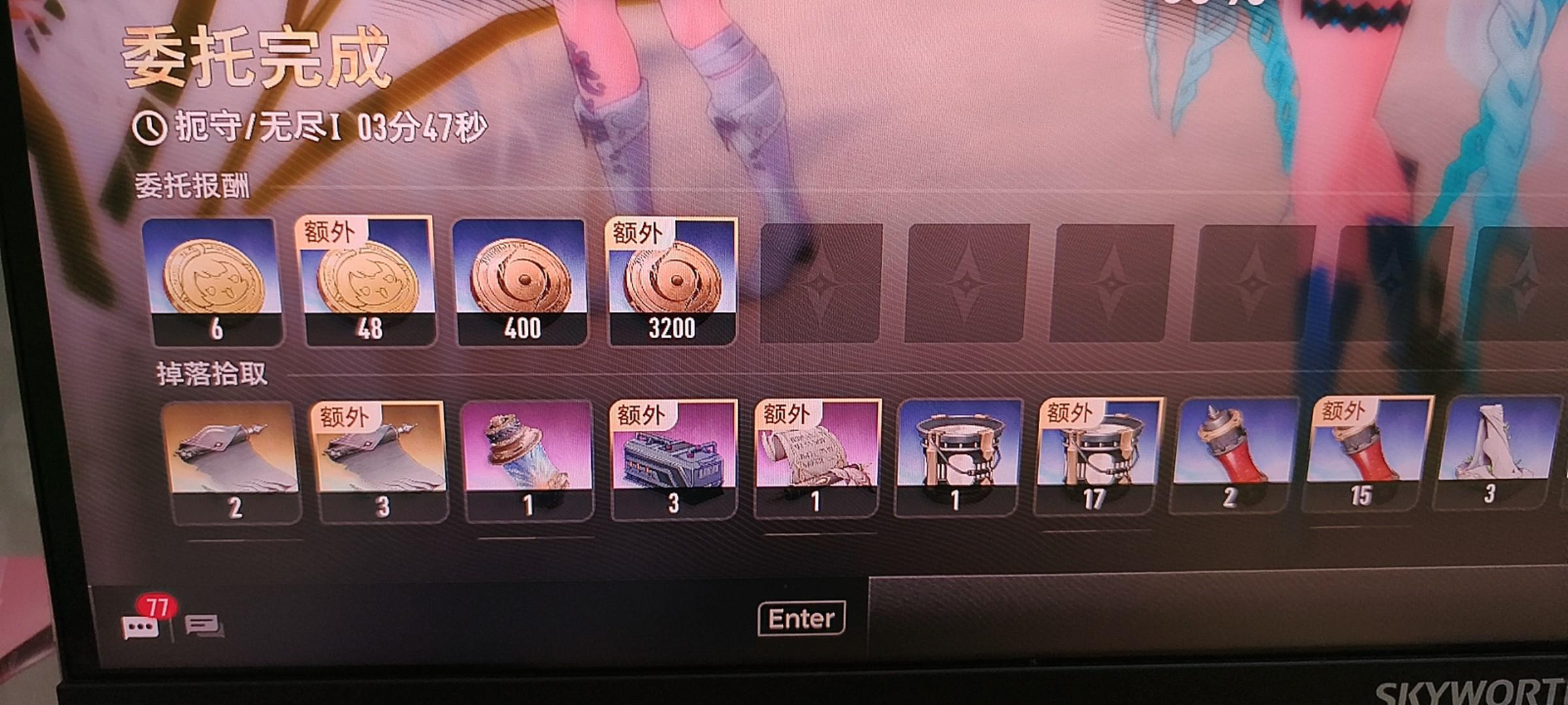 无限刷原来藏在这里,打委托本有概率掉密函线索。用多倍卡可以让一只怪进行多次掉落判定来提高掉密函线索的概率,然后是你好箱一定得抓紧搞到。图中掉落拾取一栏中,左上角标注额外的就是你好箱给的,可以看出能显著提高密函线索的掉落。
