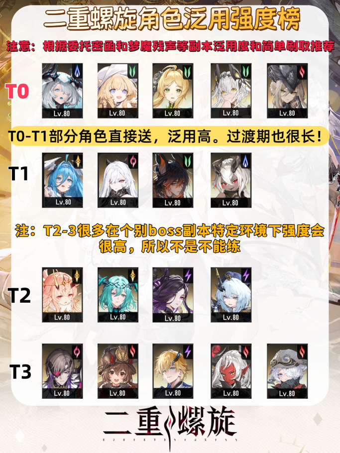 首先先放上二重螺旋公测版本的泛用角色强度榜,注意:根据委托密国和梦麼费声等副本泛用度和简单刷取推荐。
