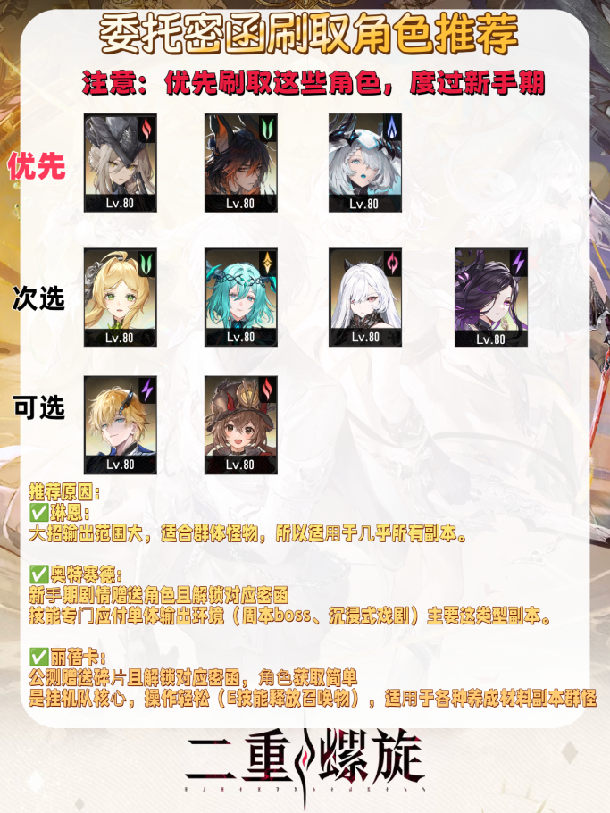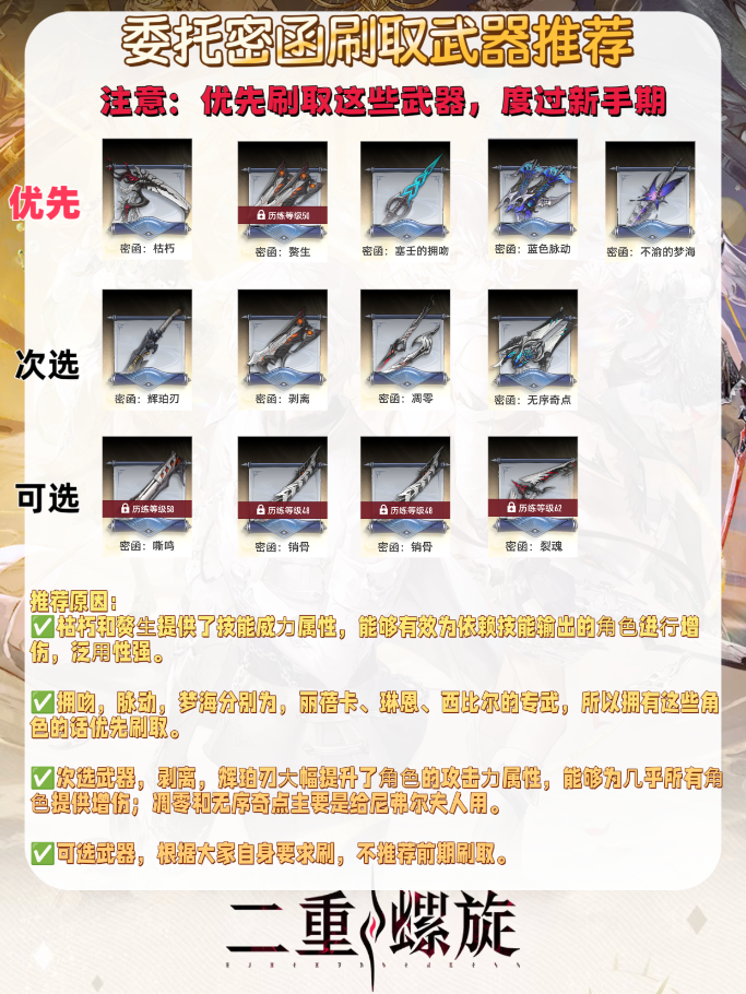 上述培养的角色部分是可以直接免费获得的,其他角色需要刷取密函进行获得,所以给大家整理了一些优先刷取的角色密函和武器密函。