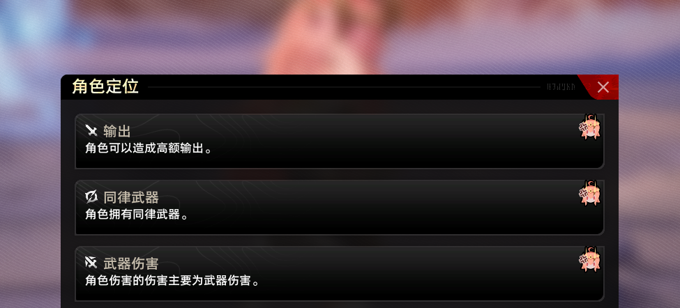 老规矩,我们先来看角色定位。莉兹贝尔主要靠武器伤害,而这个时候又多了一个概念:同律武器(就是显赫武器)这个我们放在后面去讲