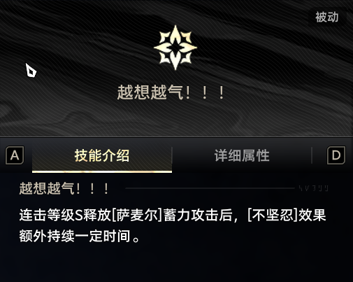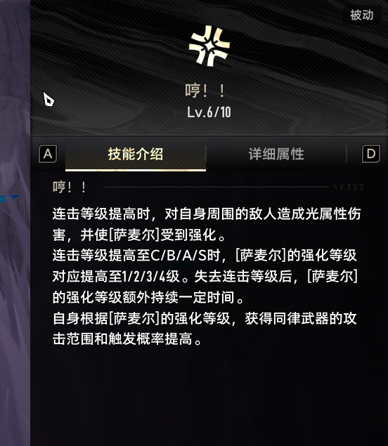 连击等级提高至C/B/A/S时,[萨麦尔]的强化等级对应提高至1/2/3/4级。失去连击等级后,【萨麦尔]的强化等级额外持续一定时间。