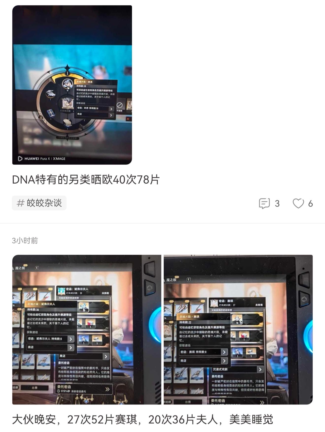 刷出的成果作为一个小添头存在,没刷出来就接着刷,看着自己仓库的碎片一点一点变多。运气好了爆率高了就丢到社区里收获一堆“你不许玩二重螺旋”和“谁问你了”,一样能获取大量快乐