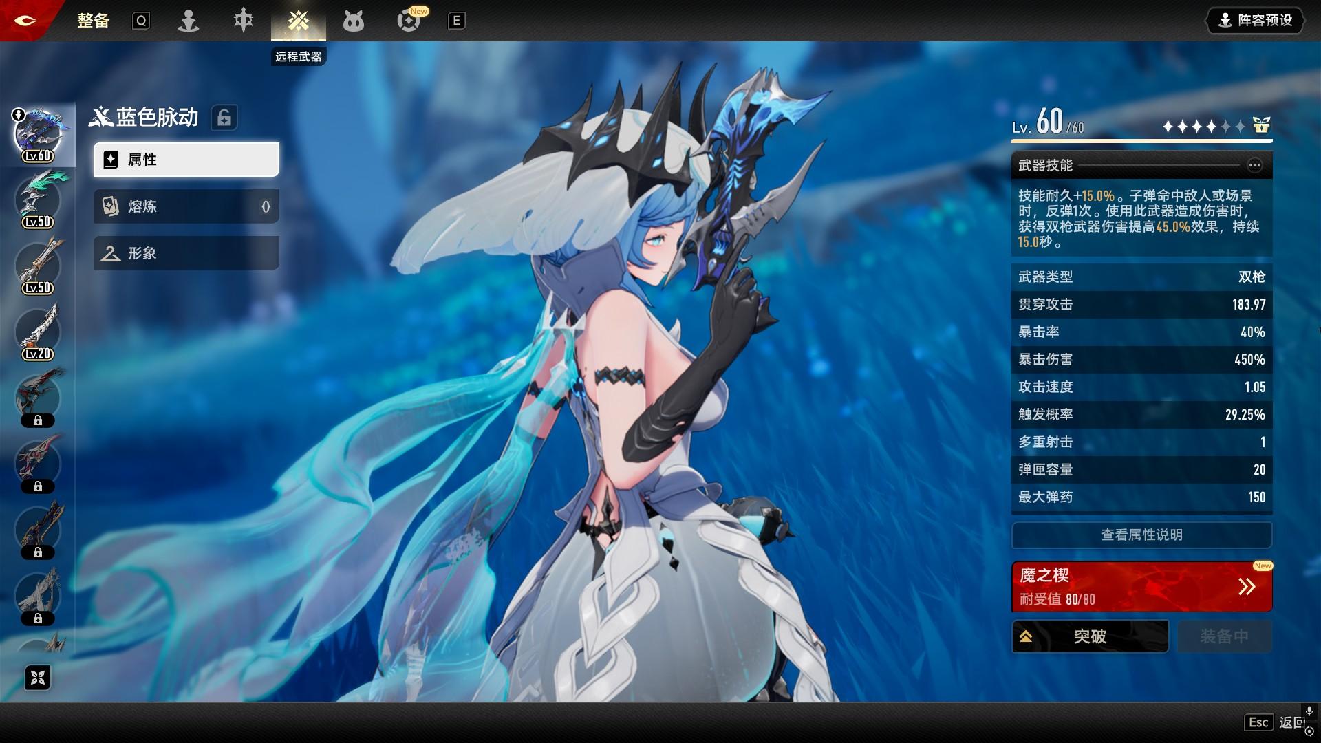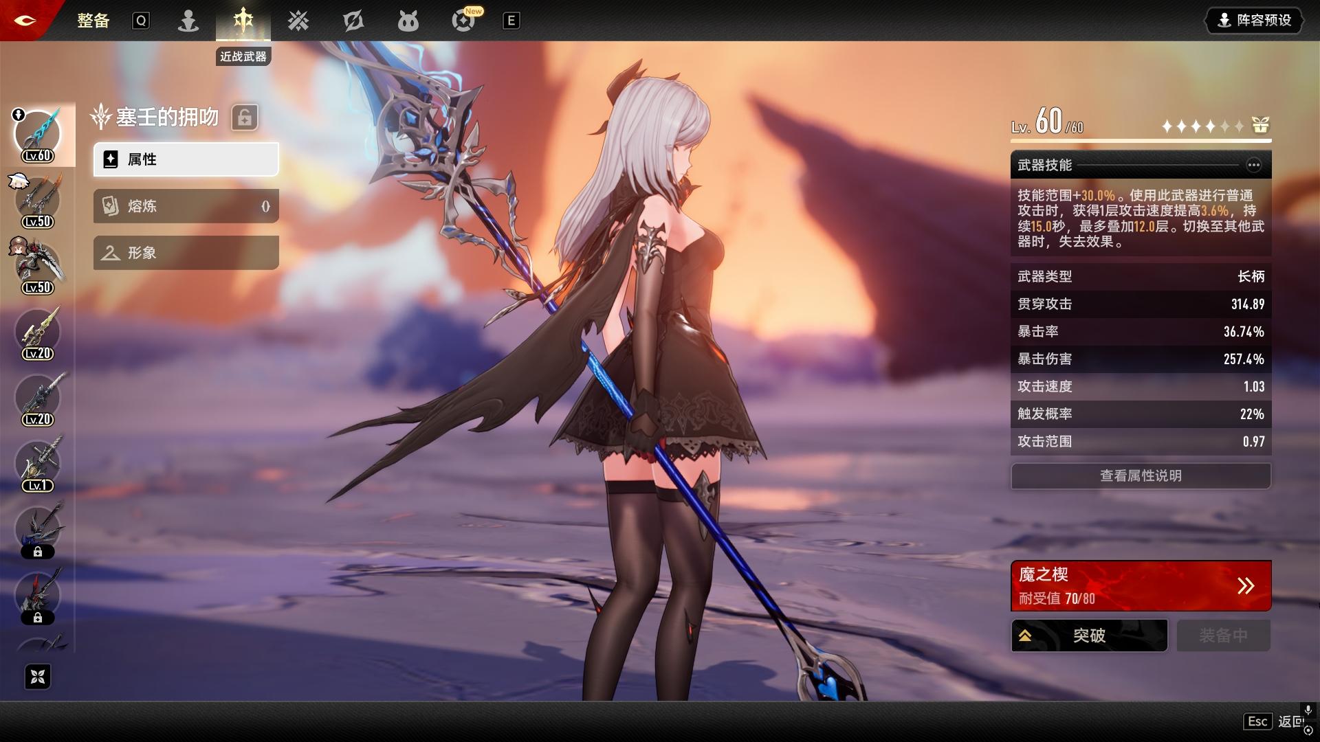 二、武器面板:近战&远程各看啥? 武器分近战和远程,面板属性各有侧重,但核心逻辑相通,新手也能快速上手: 1. 近战武器(重剑/双刀/太刀/长柄/单手剑/鞭刃) - 武器类型:每个角色有精通武器,比如水母精通长柄,装对了就有额外加成; - 暴击率/暴击伤害:游戏通用设定,暴击率是出暴击的概率,暴击伤害是暴击时的伤害倍数,常规比例1:2,优先堆平衡; - 蓄力攻击速度:长按攻击键放“重击”的速度,越快越容易打出连招; - 连击持续时间:攻击会累计连击评分,评分越高伤害越高,这个属性能延长连击的“断连时间”,手残党友好; - 攻击速度/范围:攻击速度决定平A出伤快慢,攻击范围是平A能打到的距离,按手感选就行; - 触发概率/三系攻击: - 触发概率:单次伤害触发额外效果的几率; - 贯穿攻击:触发效果时,对生命值的伤害变成1.5倍; - 切割攻击:只针对护盾,触发效果时伤害翻倍; - 震荡攻击:触发效果时,削减BOSS战姿(韧性条)的效率翻倍。
