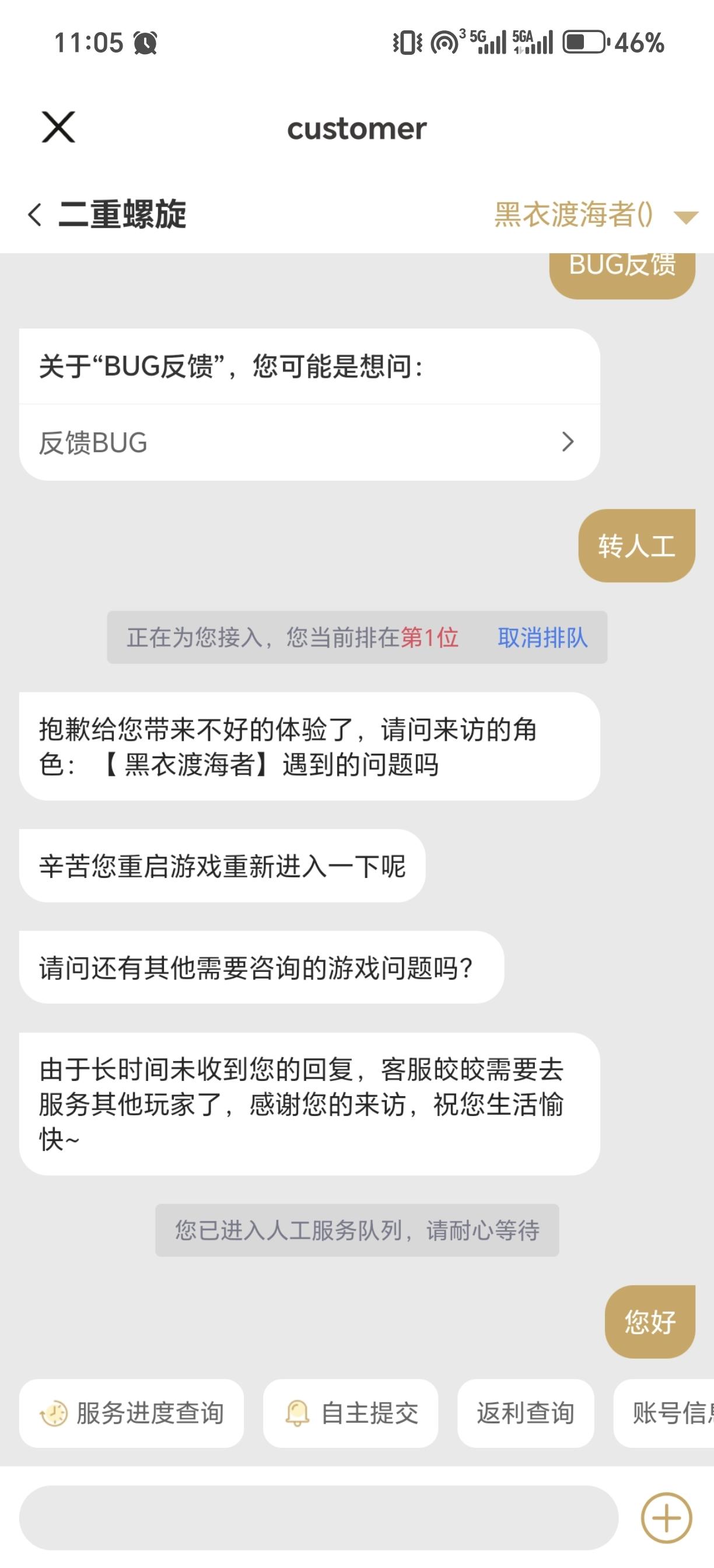 给我气笑了,这沙币客服,我“你好”两个字还没发出去就告诉我长时间未回复,我打这两个字的时间也就两秒,然后就给我结束了,别看这客服发的内容多,其实就一秒全部发出来的,不知道在哪复制粘贴的,傻逼游戏早死吧