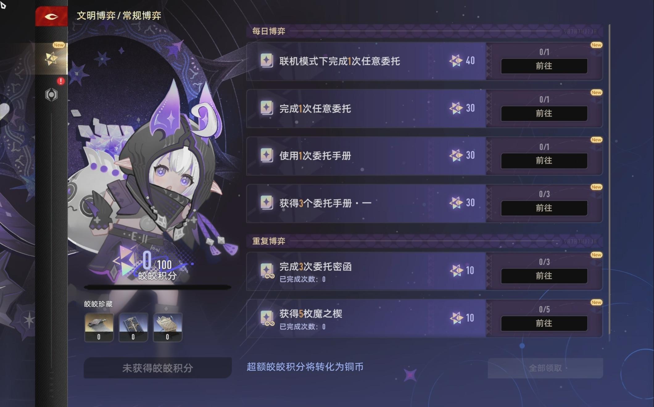两种博弈在完成难度上基本没有区别,都可以在日常的刷材料过程中完成,完成普通博弈可以获得皎皎积分以领取奖励,普通博弈分为4+2的形式,4为仅能完成一次的单次博弈,2为可以重复完成的重复博弈