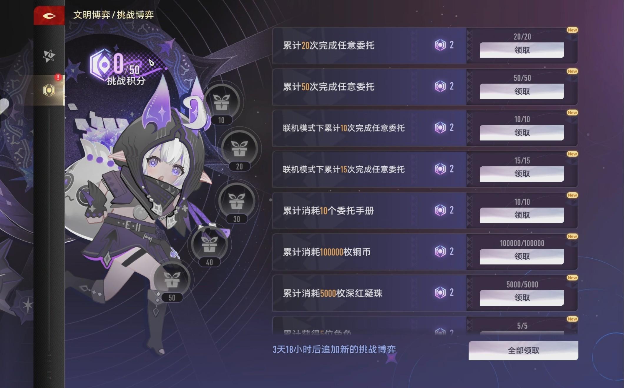 挑战博弈在完成次数等要求上比普通博弈更多,完成挑战博弈可以获得挑战积分。挑战博弈并非日常刷新,而是每隔一定周期追加新的博弈,轻度玩家也可以攒多一点一起完成