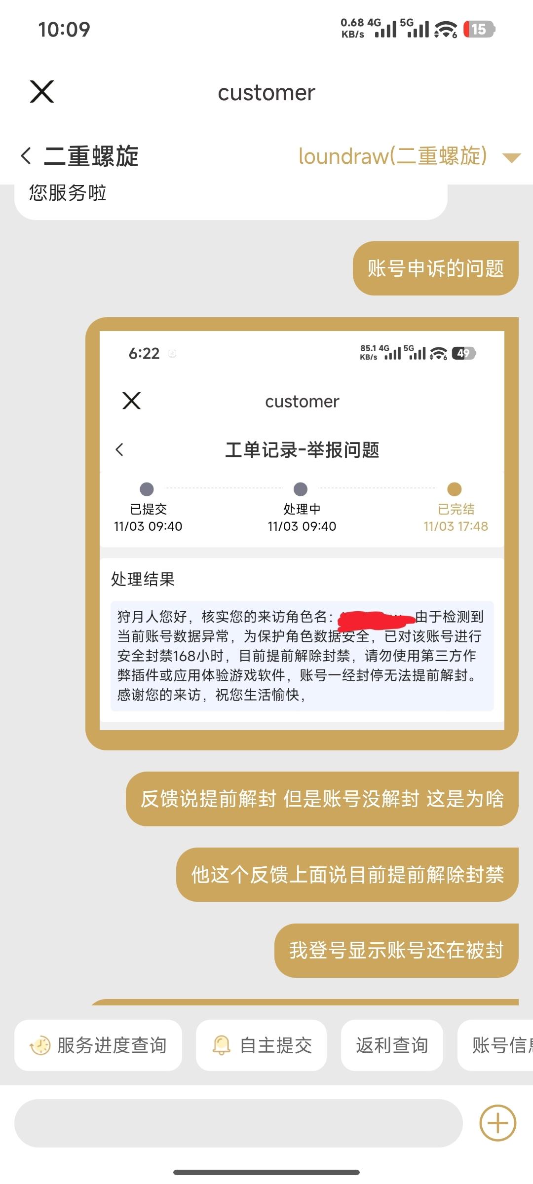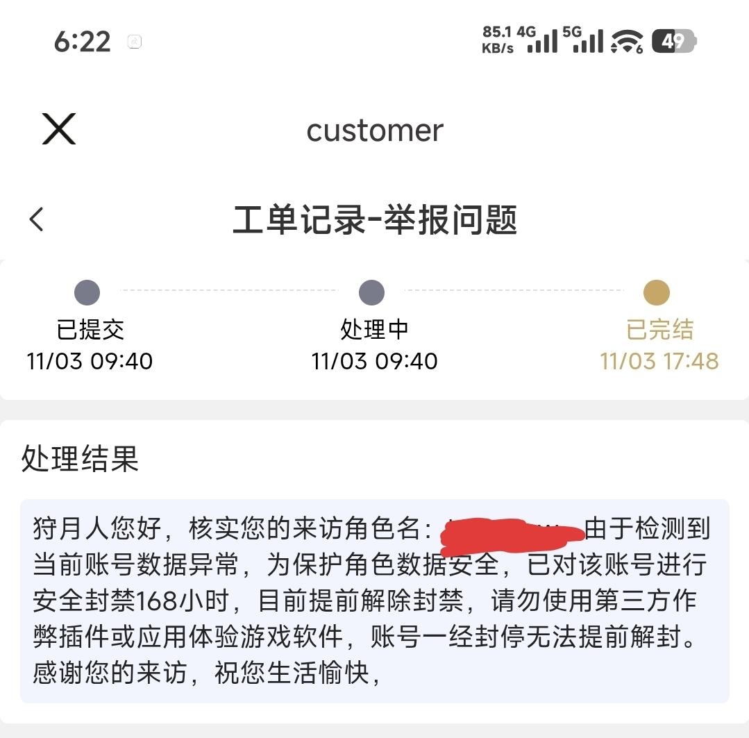 每天全程直播手操,开服当天大小月卡直接氪满,大月卡120档,直接拉到50级,各种bug节奏照样玩下去了,结果给我封了申诉反馈说提前解封,账号还在被封中,问原因就是机密,反正我们不会误封,从来没见过这么嘴硬的