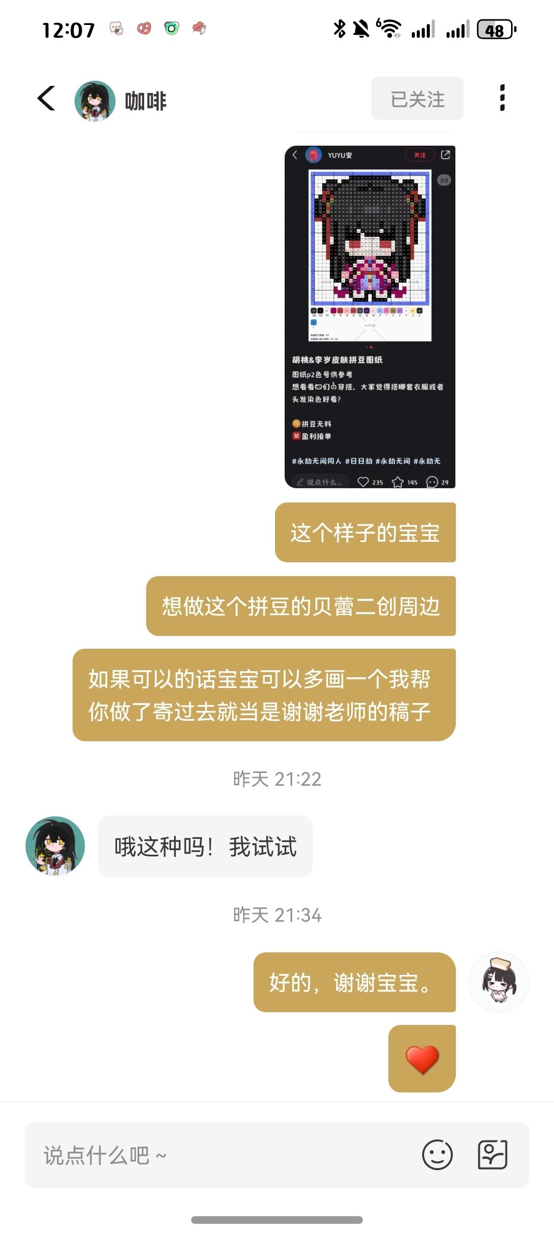 在皎皎角被太太宠幸的一天,我喜欢贝蕾但是游戏才出没多久网上没有适合拼豆的柄图于是在皎皎角发帖求太太宠幸,结果这位太太是心软的神,我提到了拼豆太太还专门转成方便我拼豆的小方块,细节啊啊啊啊啊谁懂,可爱的贝蕾qq人。我将一辈子供奉这位太太!!太太皎皎id是咖啡,原图可以移步太太主页查看,实在是过分美丽可爱!!!等我买的补充豆到齐了做出来了给大家交个作业,实在是美丽!!