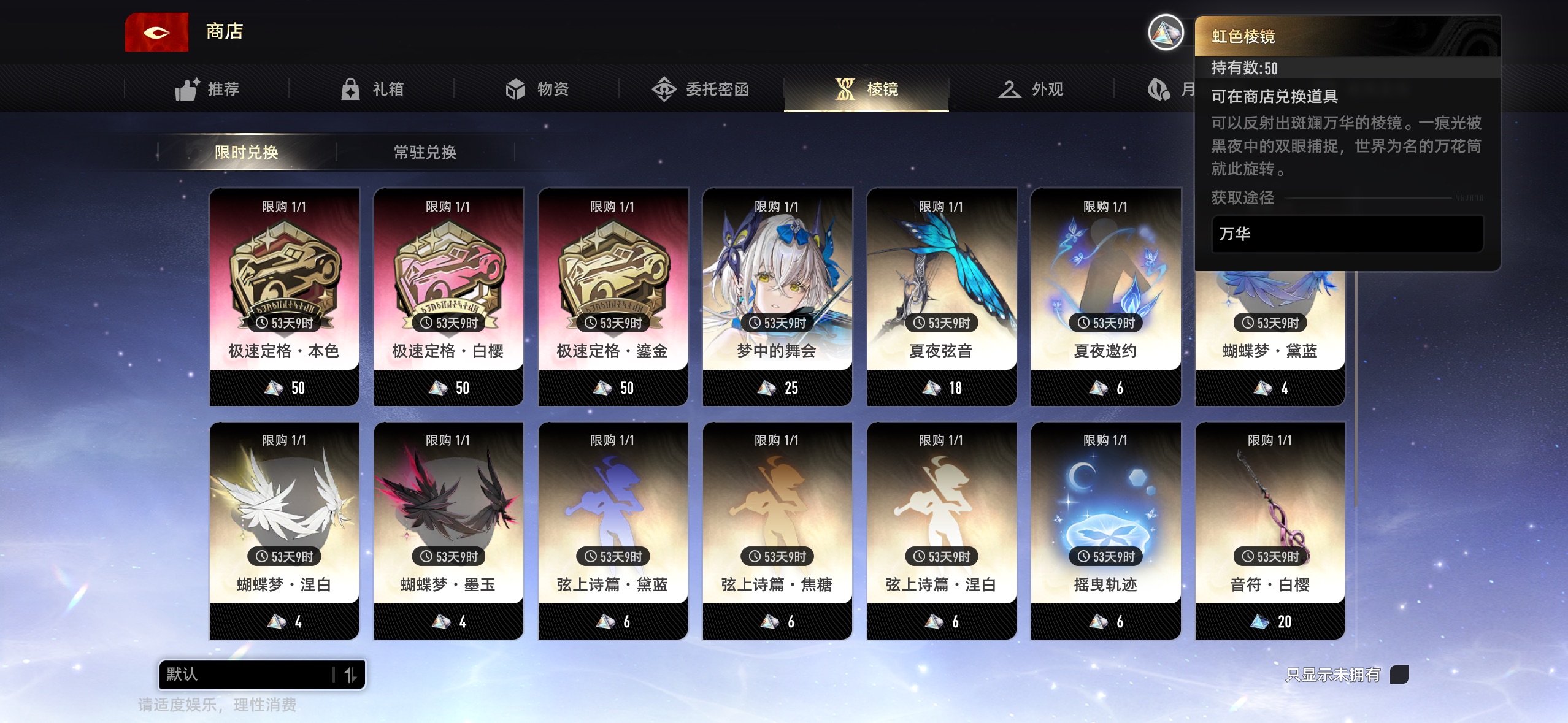 兄弟们,这个虹色棱镜不换本期的皮肤。可以等以后限定池的皮肤吗