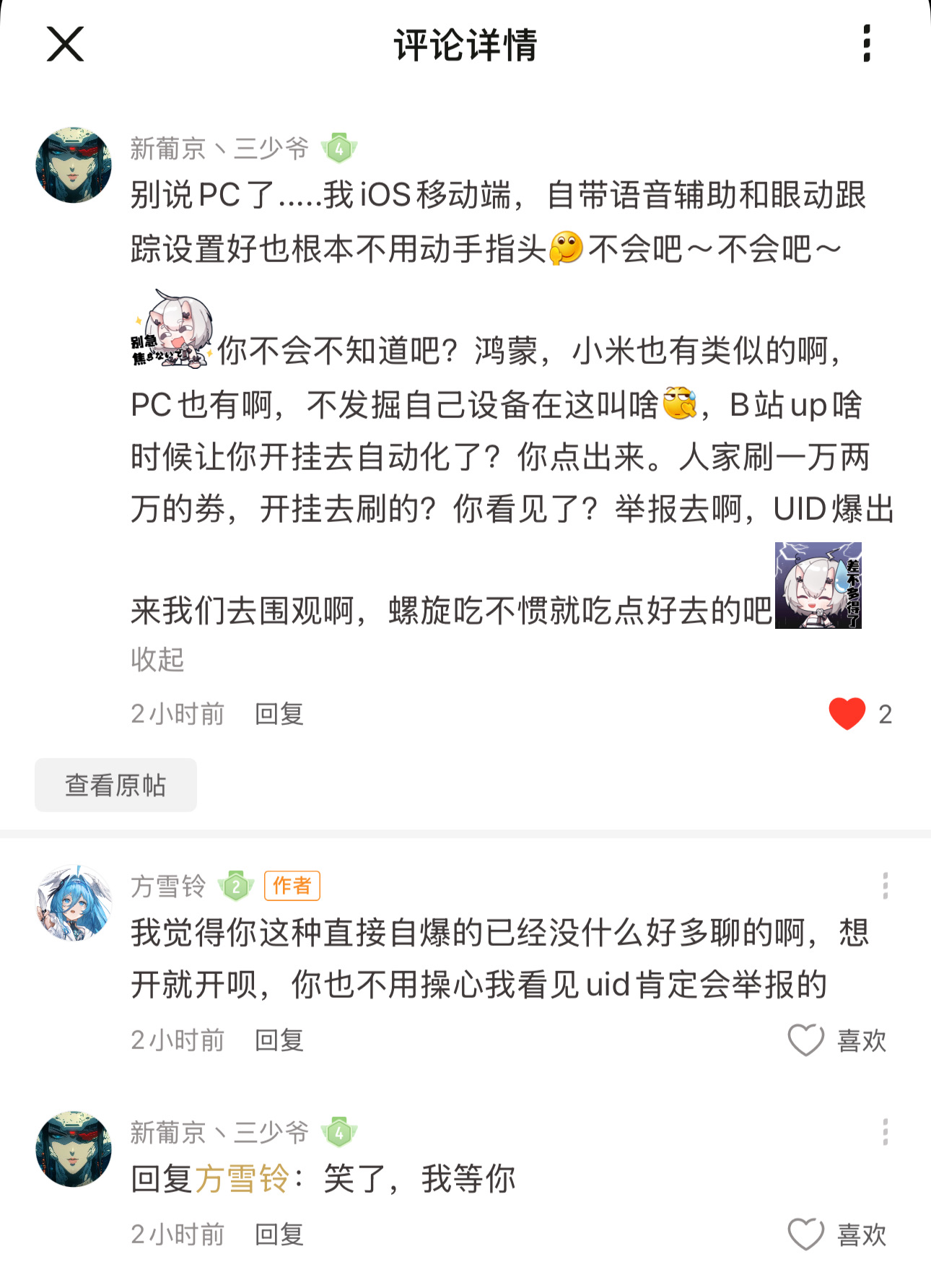 笑了,哥们一本正经的谈逻辑。实际是小丑行为。主动承认了自己在使用第三方软件。我给你明确一下。只要不是该公司主动提供的服务,皆属于第三方。什么iOS,小米,什么品牌,你别管这些,是不是这个游戏自带的?不是,那就是第三方。而游戏条约明确不允许使用第三方(无论何种原因,就算官方理解你,也有权封禁。)。至于封不封,看官方态度,封了也别叫。