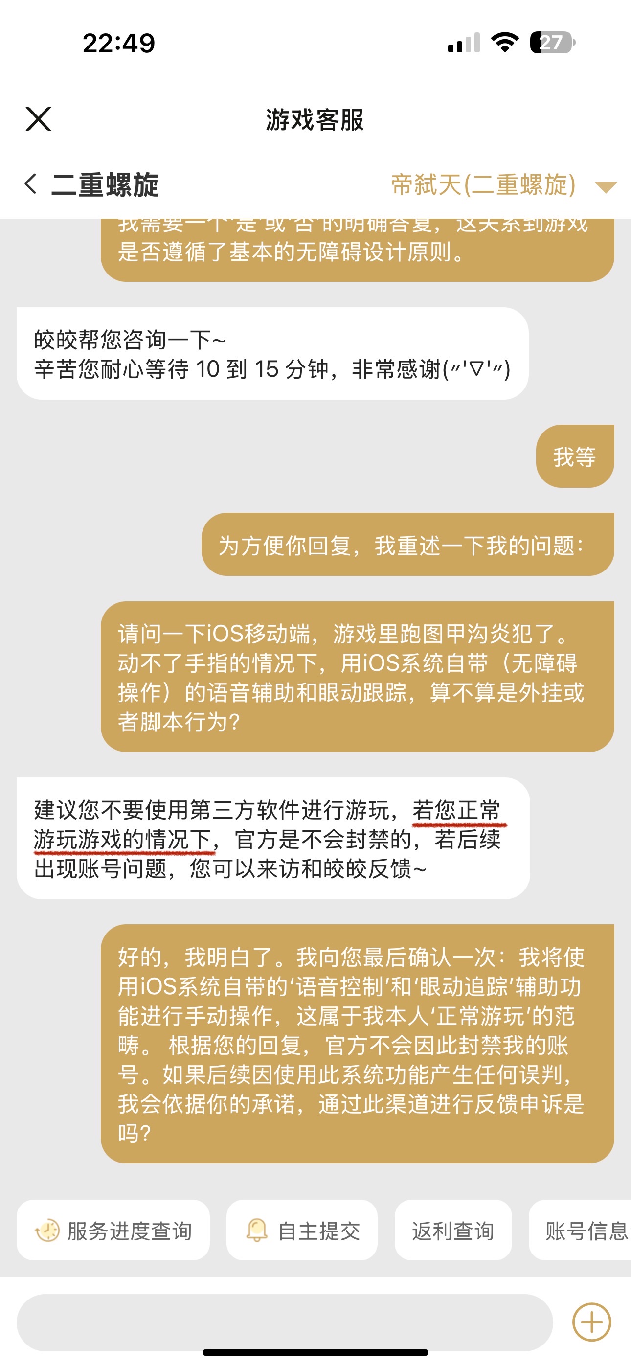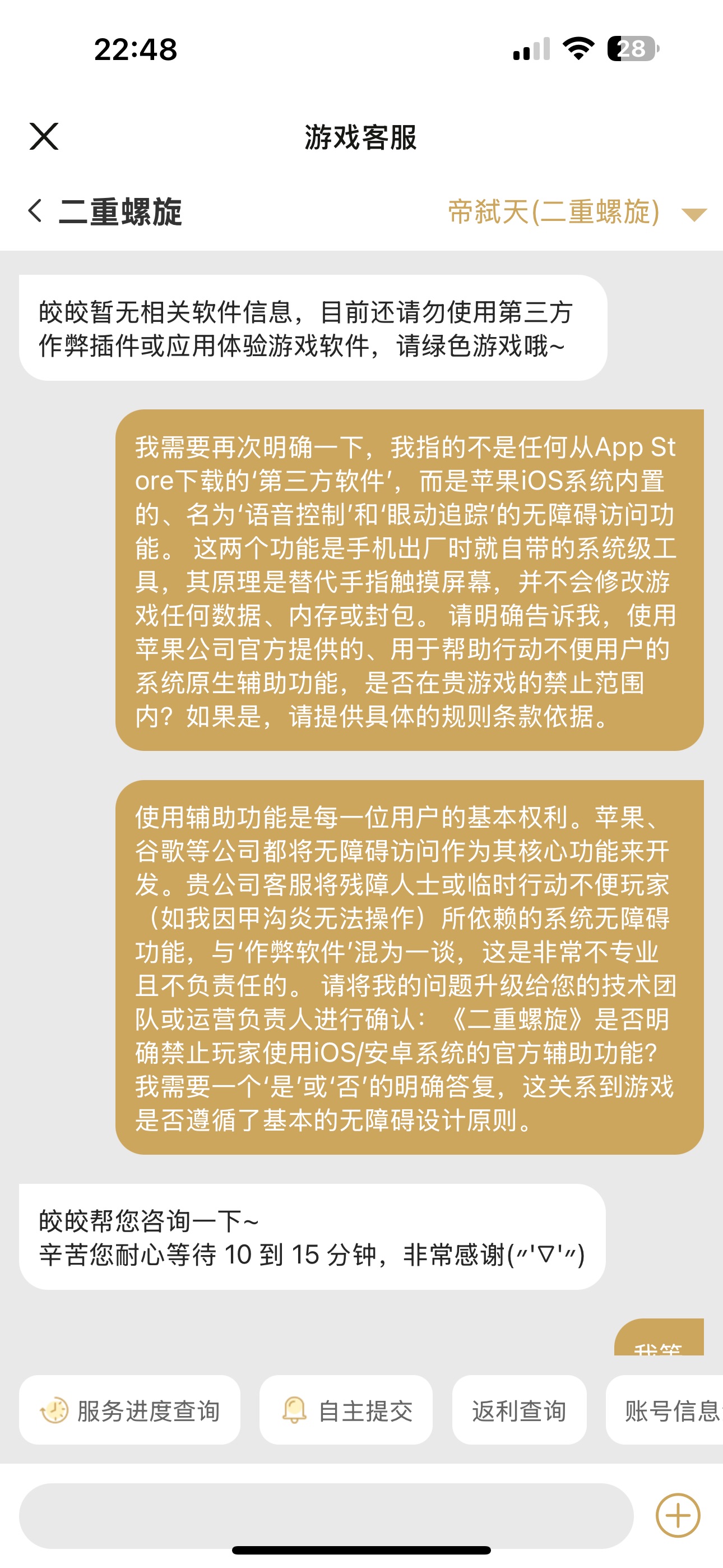 当客服的模板式回复,遇上玩家的精准定义与逻辑归谬。 从“勿用第三方”的警告,到“正常游玩不会封禁”的承诺,是对所有依赖无障碍功能玩家的一个先例!