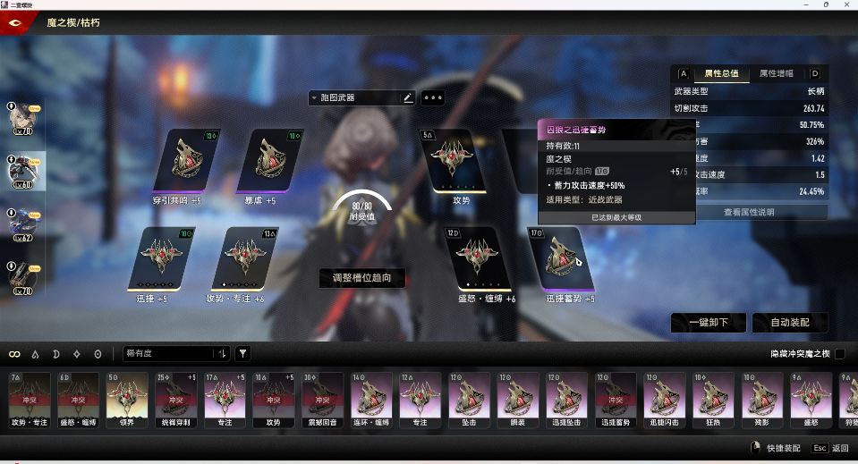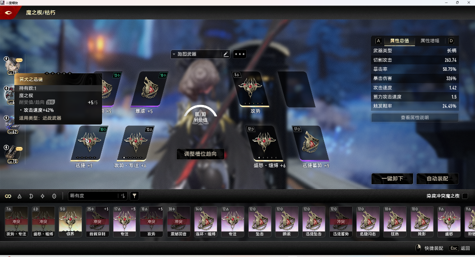 春玦戢加10迅捷,没有之一,伤害够的情况下一律穿攻速枪,尤其是在联机环境下,10迅捷春玦戢的冲刺手感没有下降很多,除了略微的卡顿回拉,也可以冲的很快。