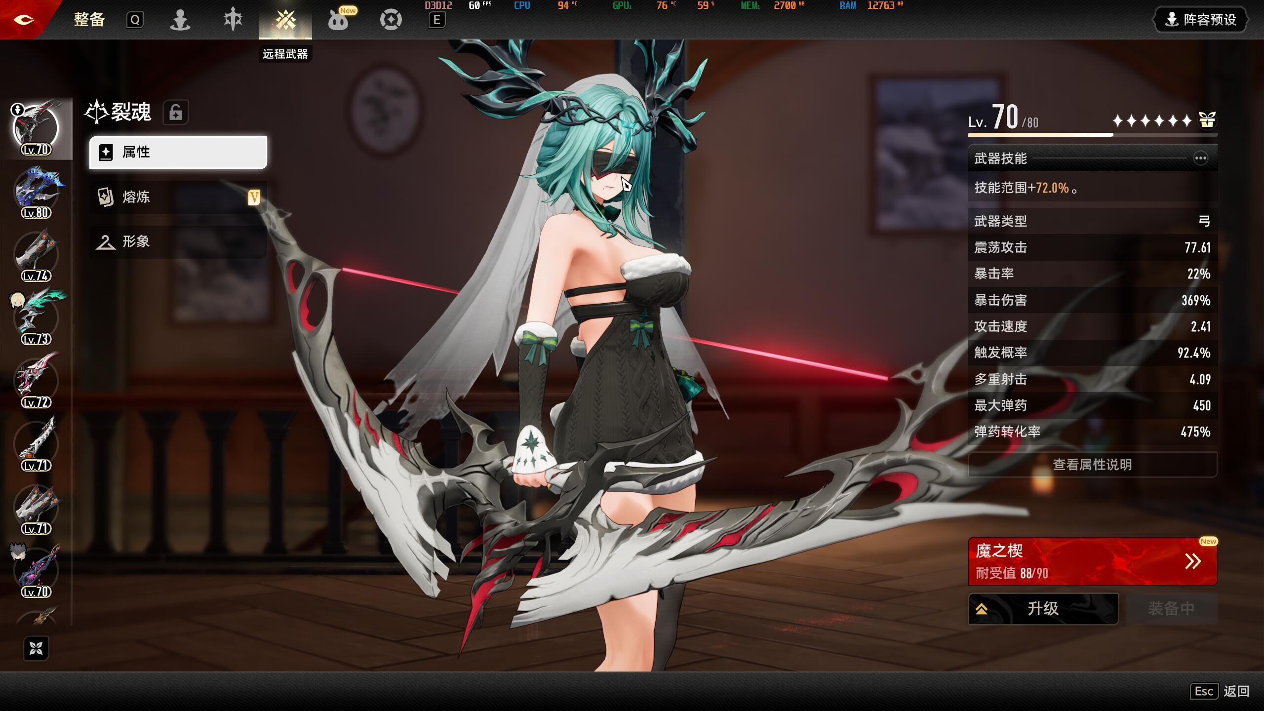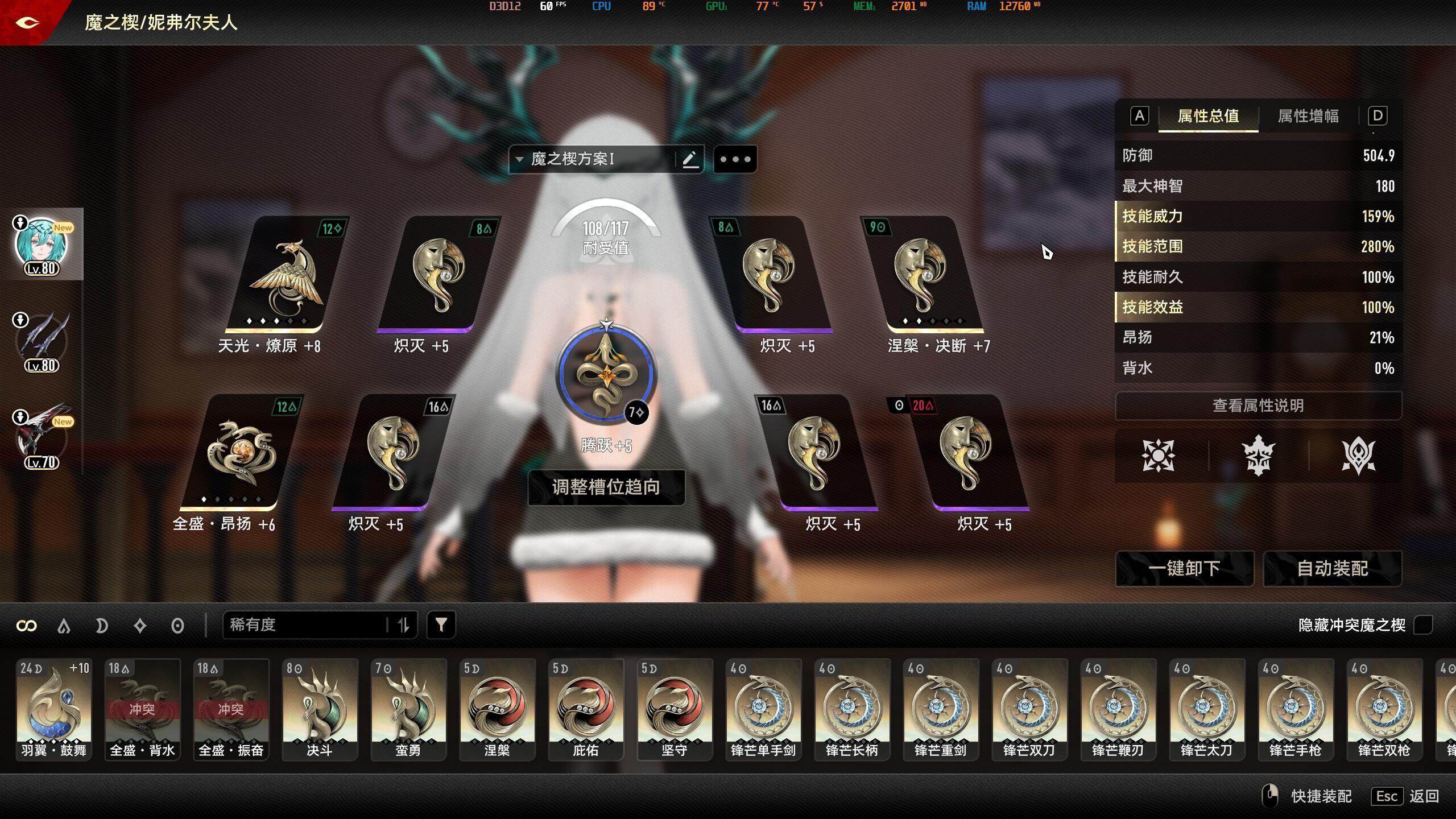 实测夫人技能范围超过280的部分并不能通过大招转化成技能威力。用塞壬(长枪穿引共鸣赶路)和花弓就够了,这两把武器加起来120范围,夫人自带30,狮鹫天光燎原+9有30范围,正好280范围。