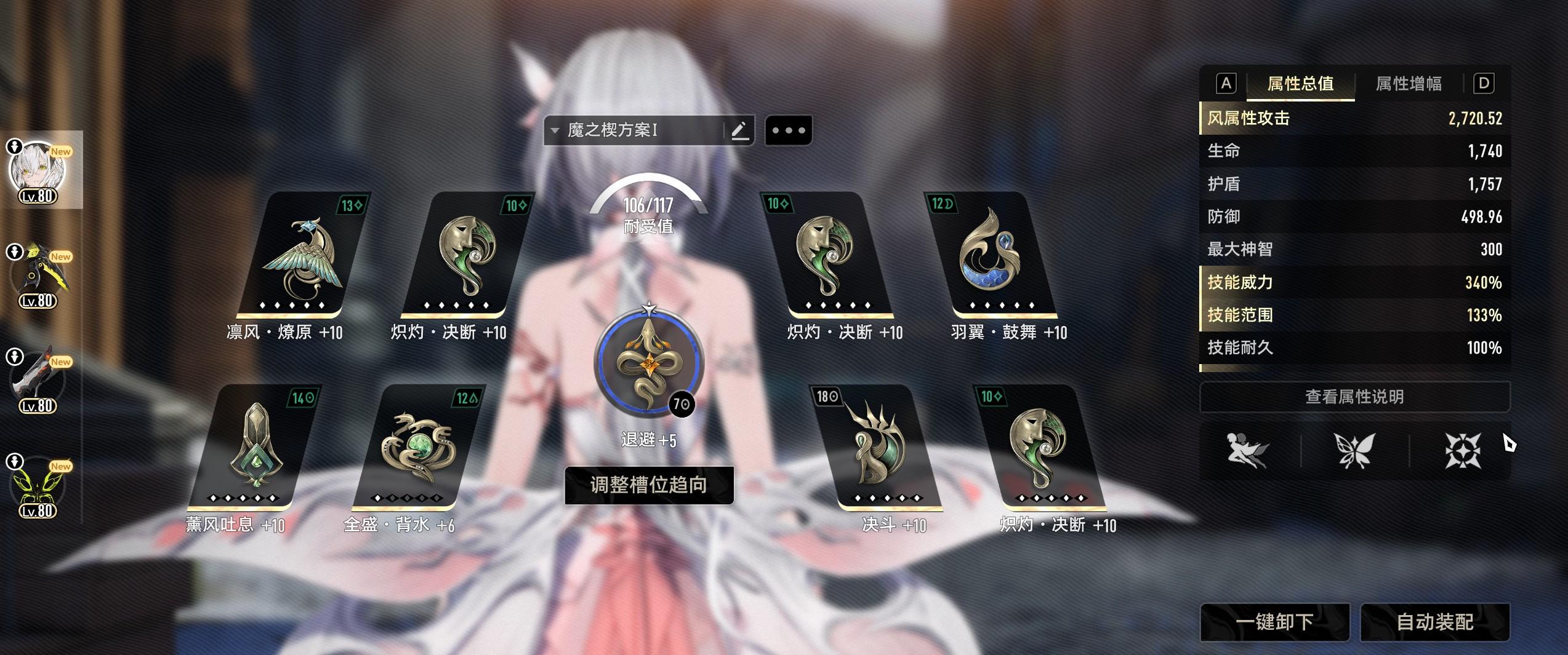 懒人毕业套装,背水确实没什么用,我血量降不下去,因为老是要用技能触发熏风,但是又懒得刷,所以还是带了个背水