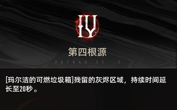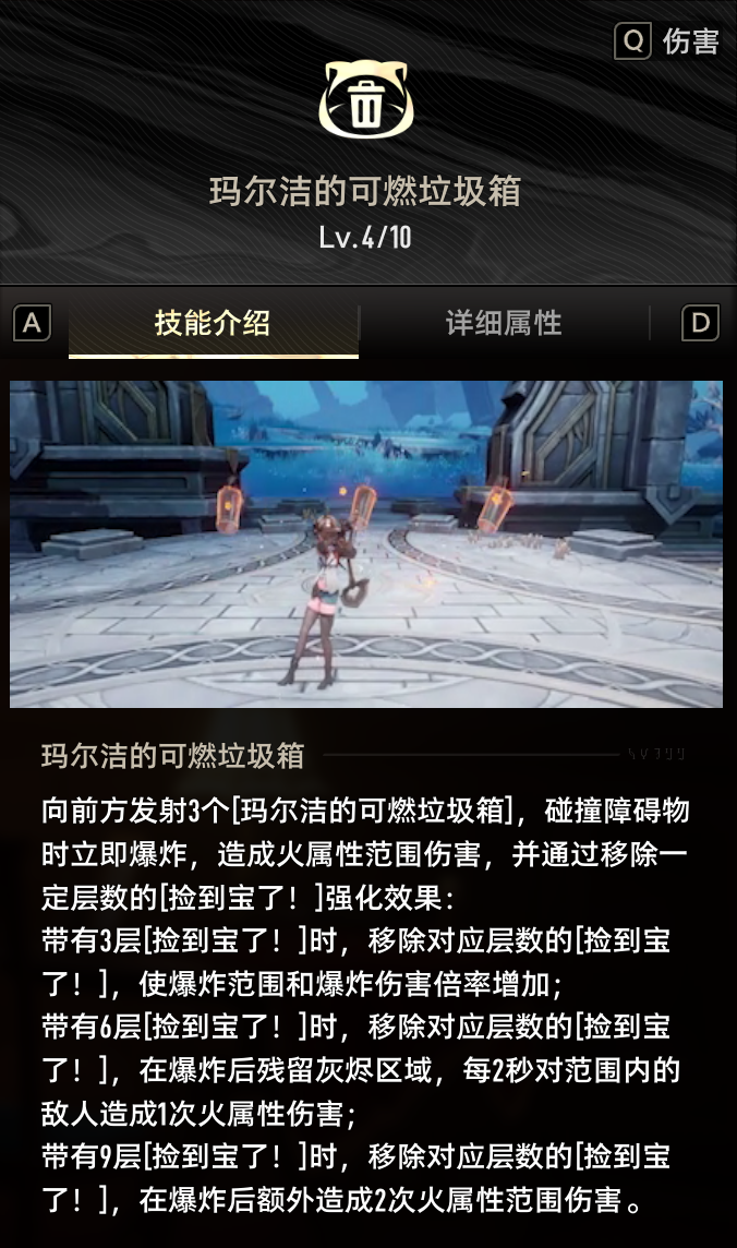 玛尔洁向前方扔出三个燃烧垃圾箱,碰到障碍物立即爆炸。根据“捡到宝了”层数不同,移除相应层数获得不同的额外效果:
