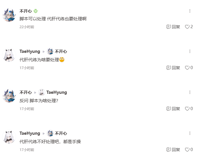 首先看这个聊天记录1问的是你怎么处理,而你的回答是难处理2官方禁止任何影响游戏公平性的方法,那么代肝和脚本本质上有什么不同,都是利用空余时间,我的问题是对其他绿色玩家正常游玩影响不都是一样的吗