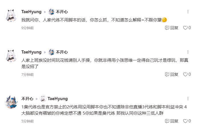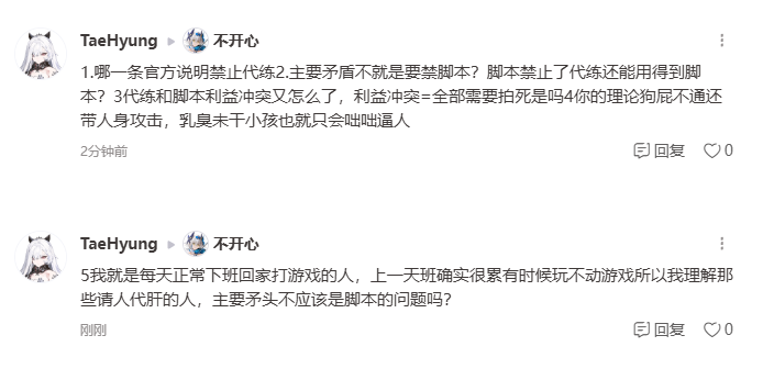 你的倒数第2条评论说错了,代肝也是官方禁止的第三方,你可以去看官方公告。主要矛盾是普通玩家与使用第三方的玩家不只是片面的脚本。代肝与脚本的利益是冲突,大部分情况下脚本可以完成代肝的作用,还不用花钱,反对脚本的人其中很多是代肝,最后一条,你说你自己没有时间,那么脚本和代练不一样吗?不都是利用空余时间吗,怎么脚本是错的,代练就是对的