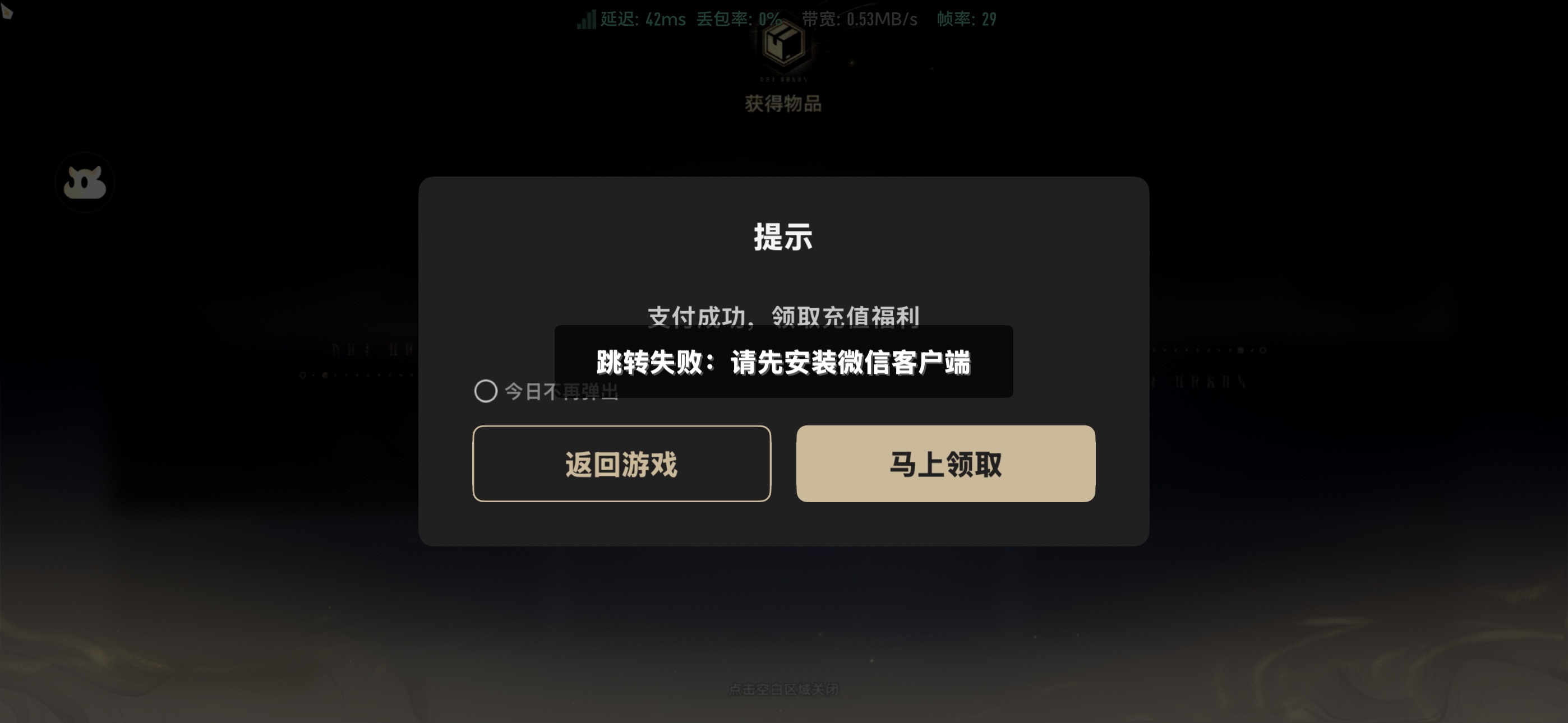 我充值后面就弹了这个框,我用云游戏玩的,现在都不知道在哪里领奖励