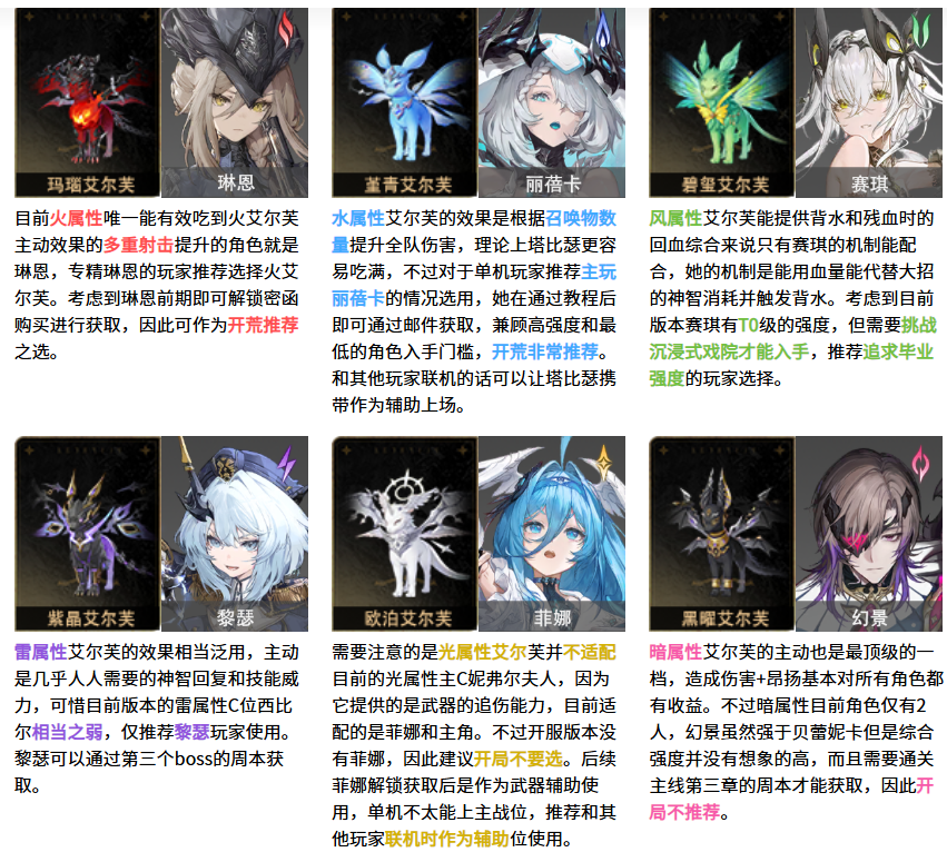 当前版本的6个属性最强魔灵都有适配角色,建议根据自己主要资源倾斜的角色进行选择,以下为适配情况: