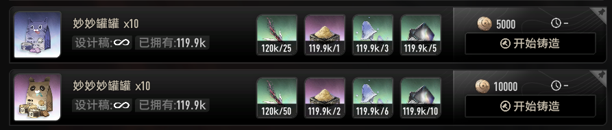 (铸造界面,消耗指定道具就能制作罐罐类道具)