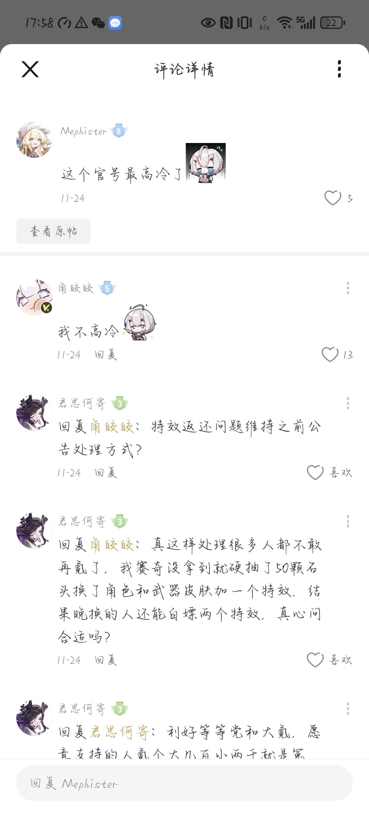 下面有些反馈游戏问题的评论有些可能还语气挺冲的,皎皎角的几个官号应该都是专门做社区的不是游戏项目组的反馈bug大可以直接在游戏里点反馈,他们反馈路径也和我们差不多,没必要去冲官号