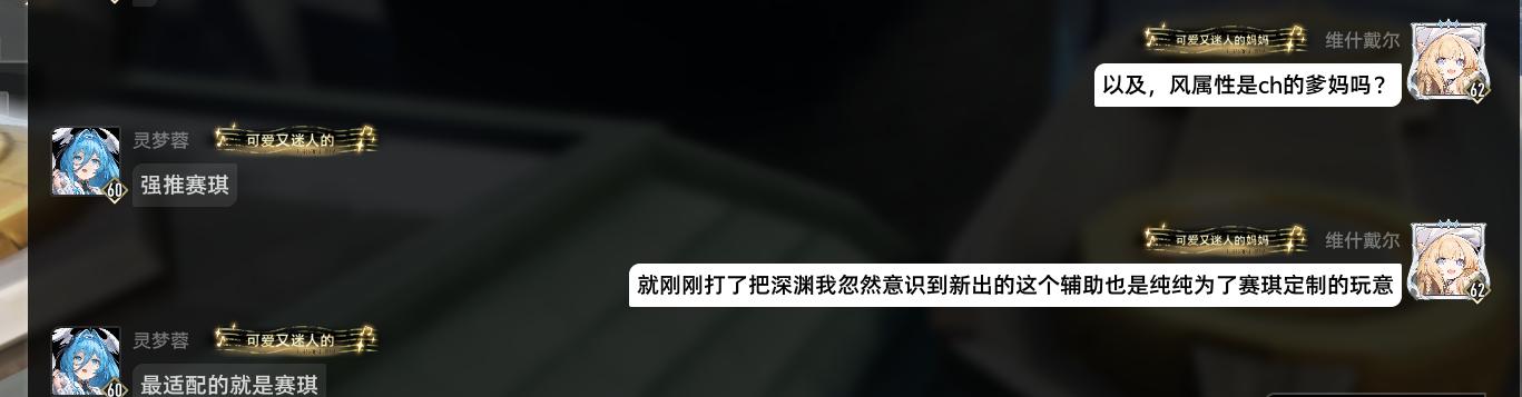别慌,下一个辅助角色是扶疏,二骡子的人权卡。最适配扶疏的那几个角色中依旧有赛琪,整个开服版本和华胥版本赛琪挑辅助跟选妃一样,给的总伤增幅低于60%都不配给赛琪当队友