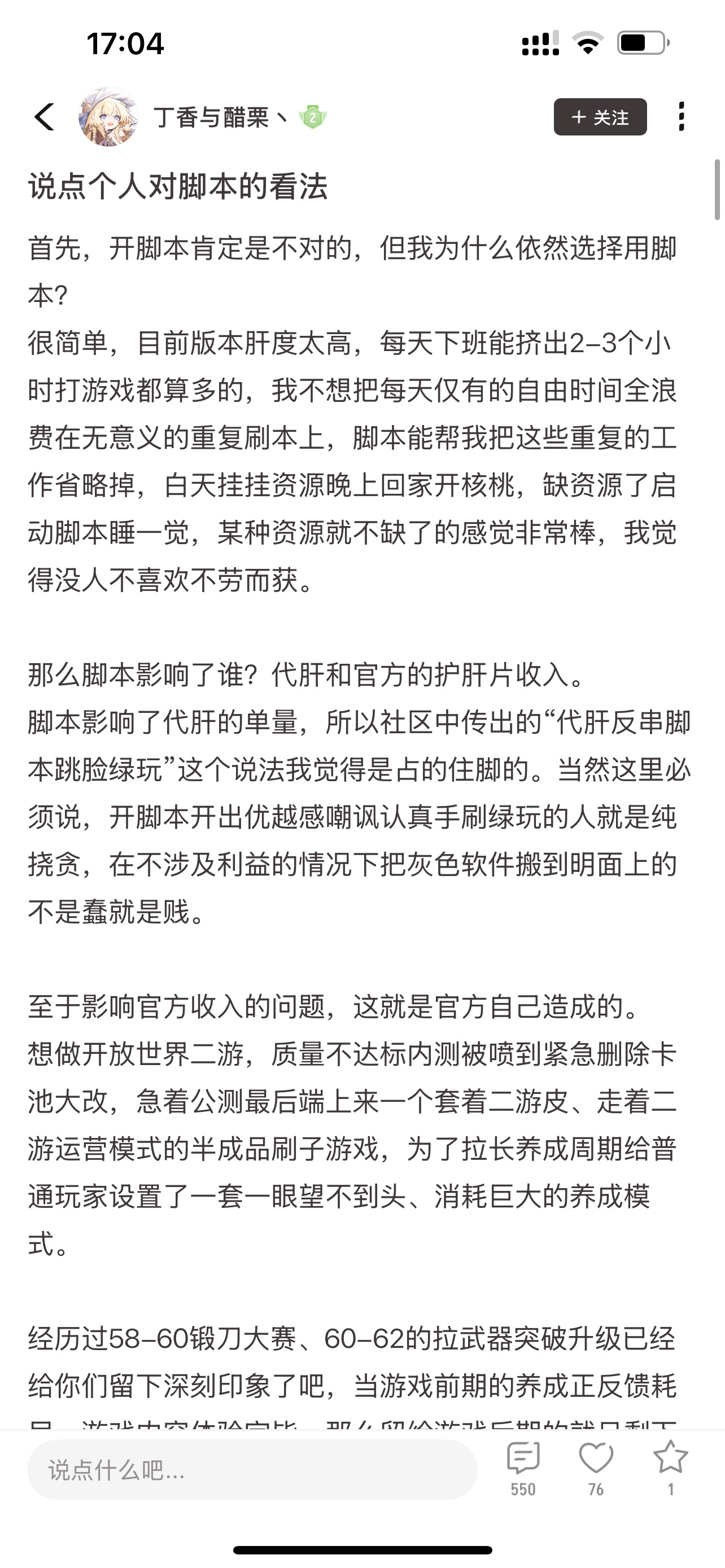 我无意讨论脚本与代肝间是否存在利益冲突问题,也不想携带明显的绿玩/脚本方立场,因此仅欢迎友善讨论,不想看见任何人身攻击与谩骂还有反串行为。