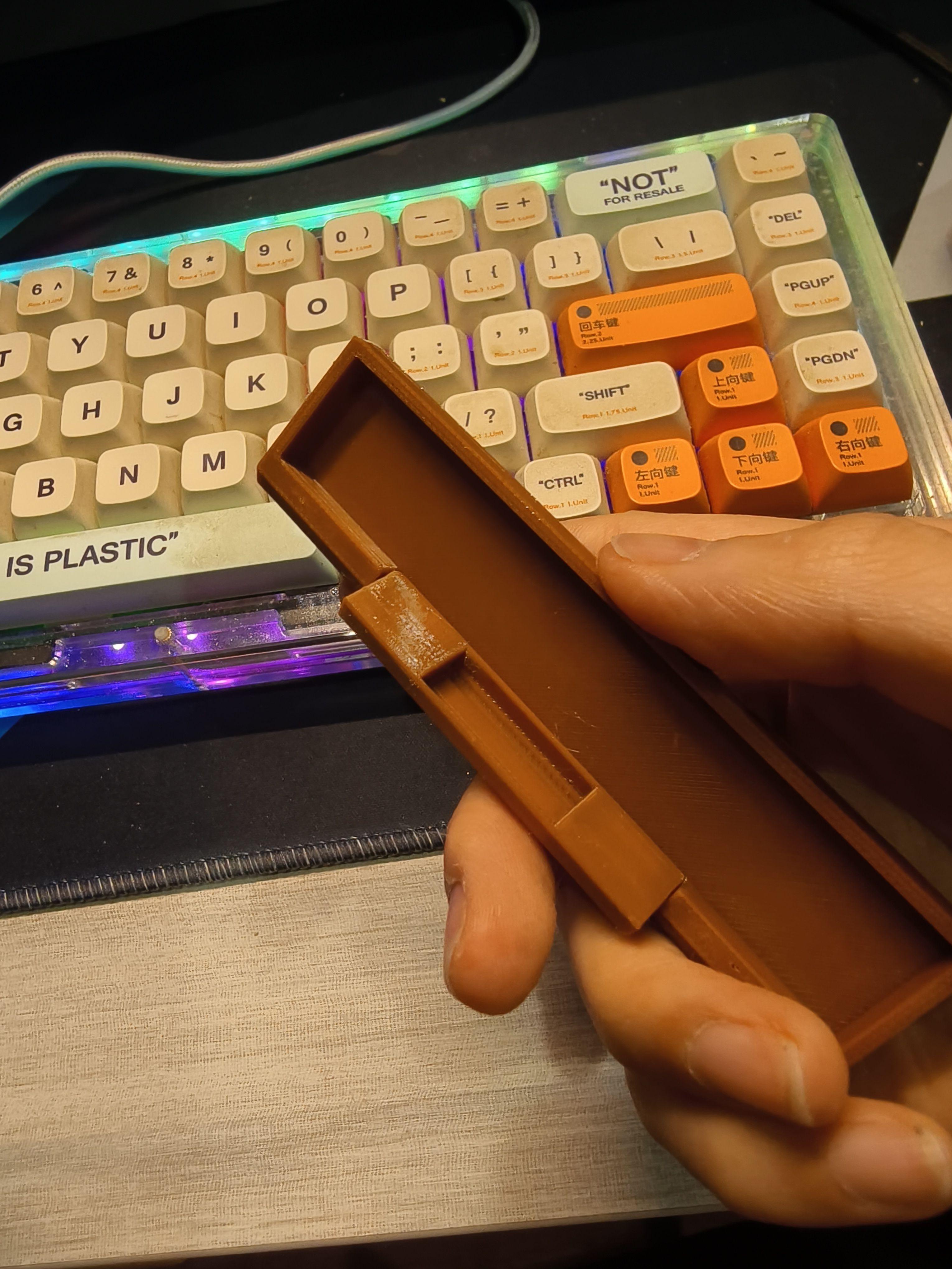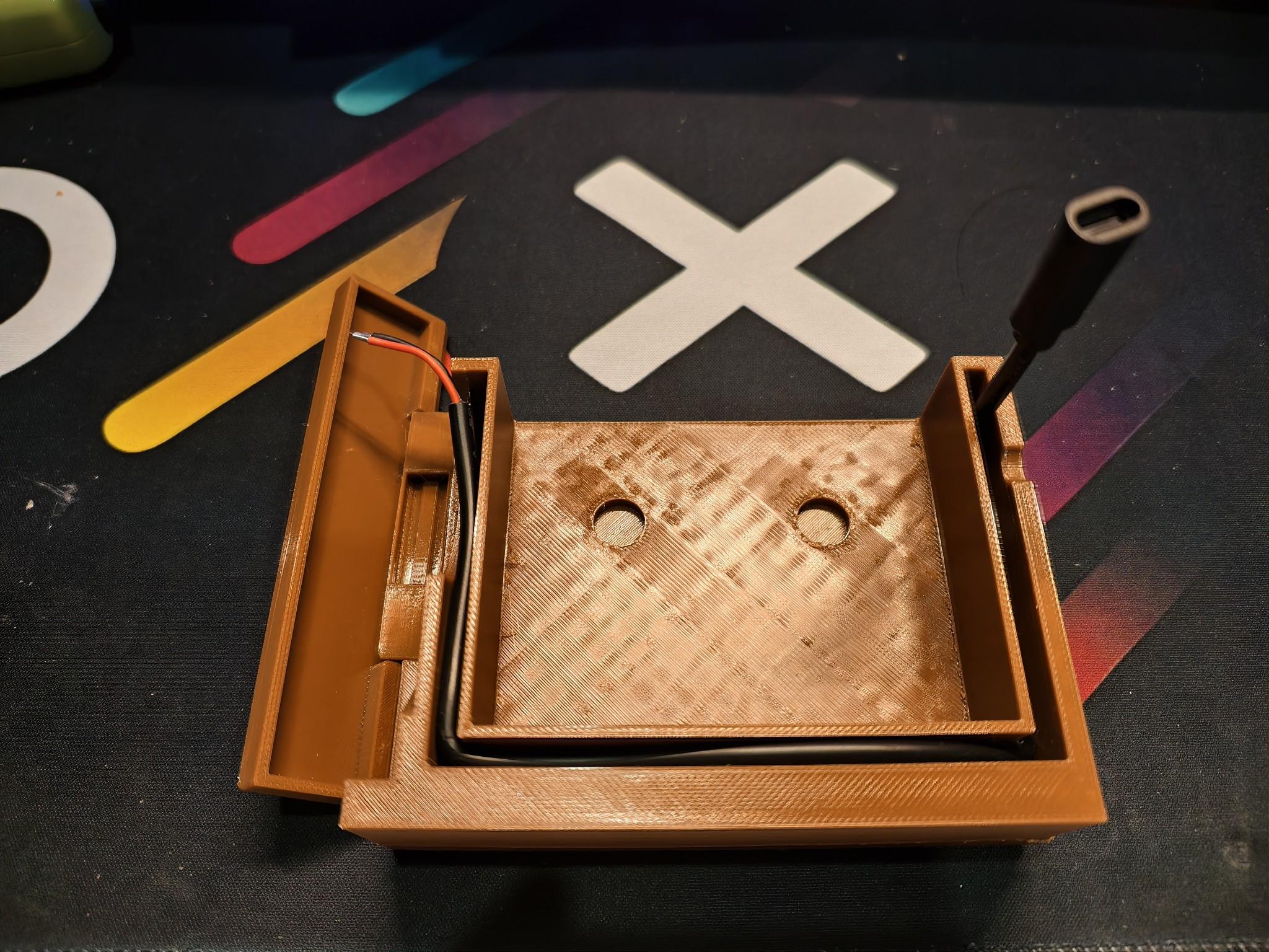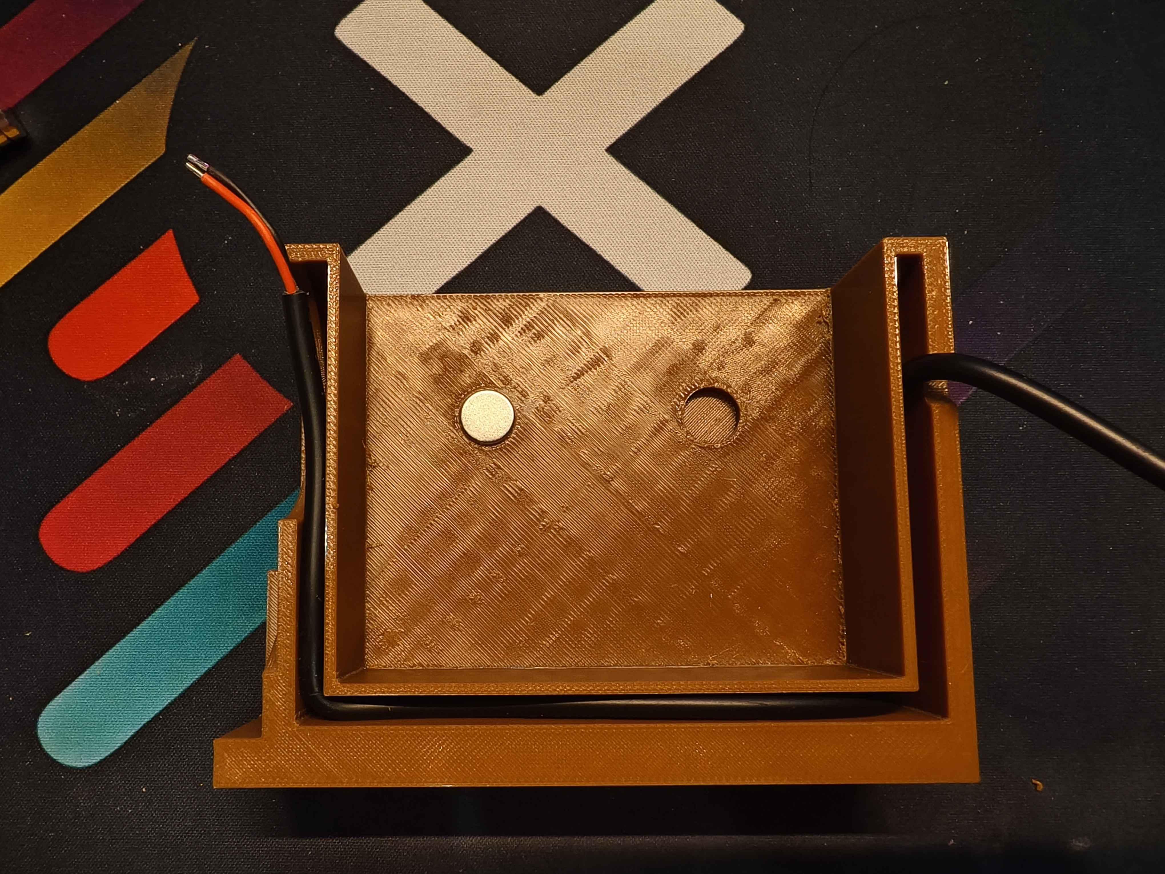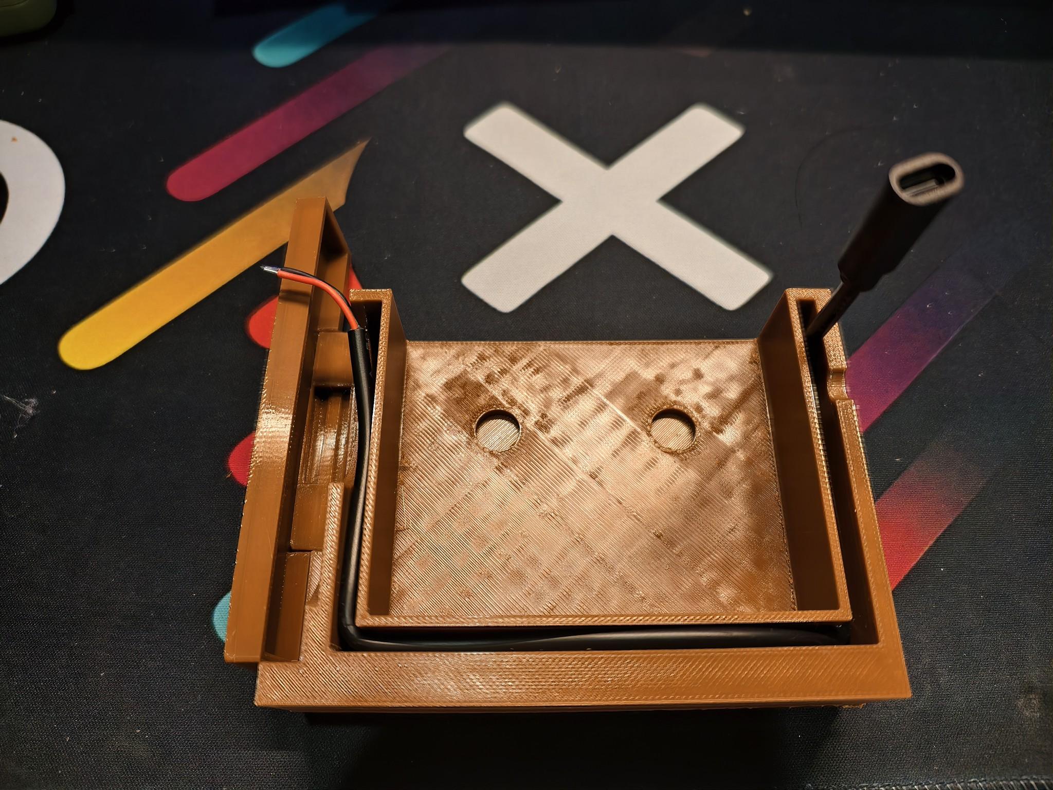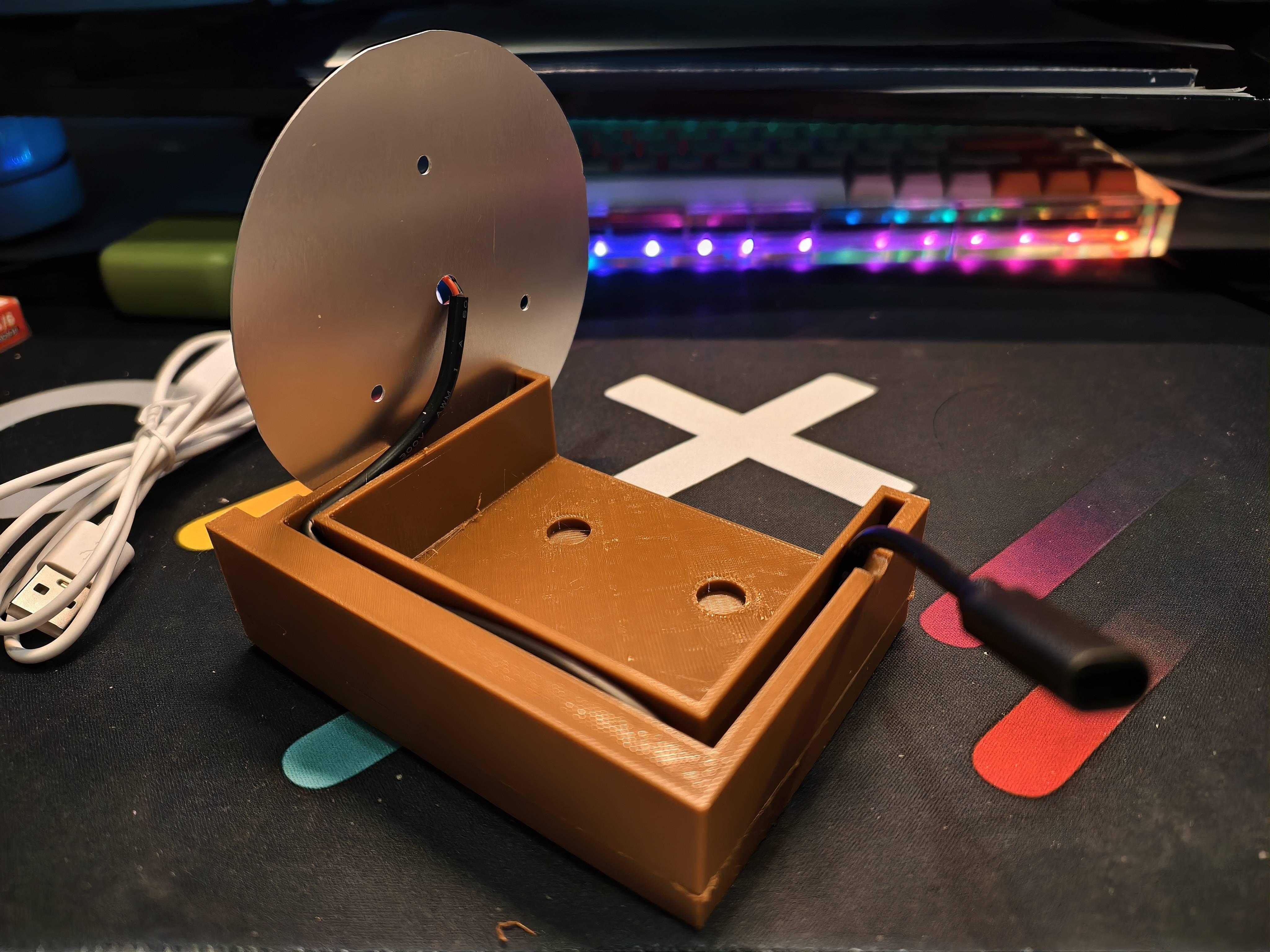 今天从快递皎皎手上拿到了咖啡色耗材和部分元器件,赶着时间就开始测试了。因为是结构测试,只打印了必要的部分,但打印时间也足足花了四个小时。好在颜色跟预想的差不多,没有太大色差。目前看来内部的灯组电路走线没有太大问题,底部的磁铁也能正好塞进凹槽卡住,就是很可能会拿不出来转轴部分也能正常装配,并且实现开合功能,就是同样地金属销装进去就出不来了,后面会想办法优化改进。
