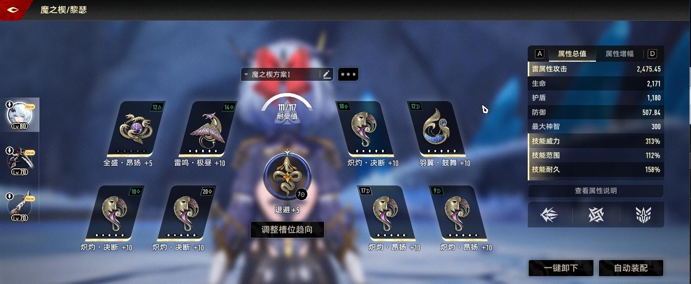 黎瑟挂机套:3炽灼昂扬+2炽灼决断(或3决断+2昂扬),全盛昂扬+狮鹫雷鸣–极昼+金羽翼鼓舞(默认+8)没有+8的同学留一个位置换永恒克己(还不快肝起来!)。