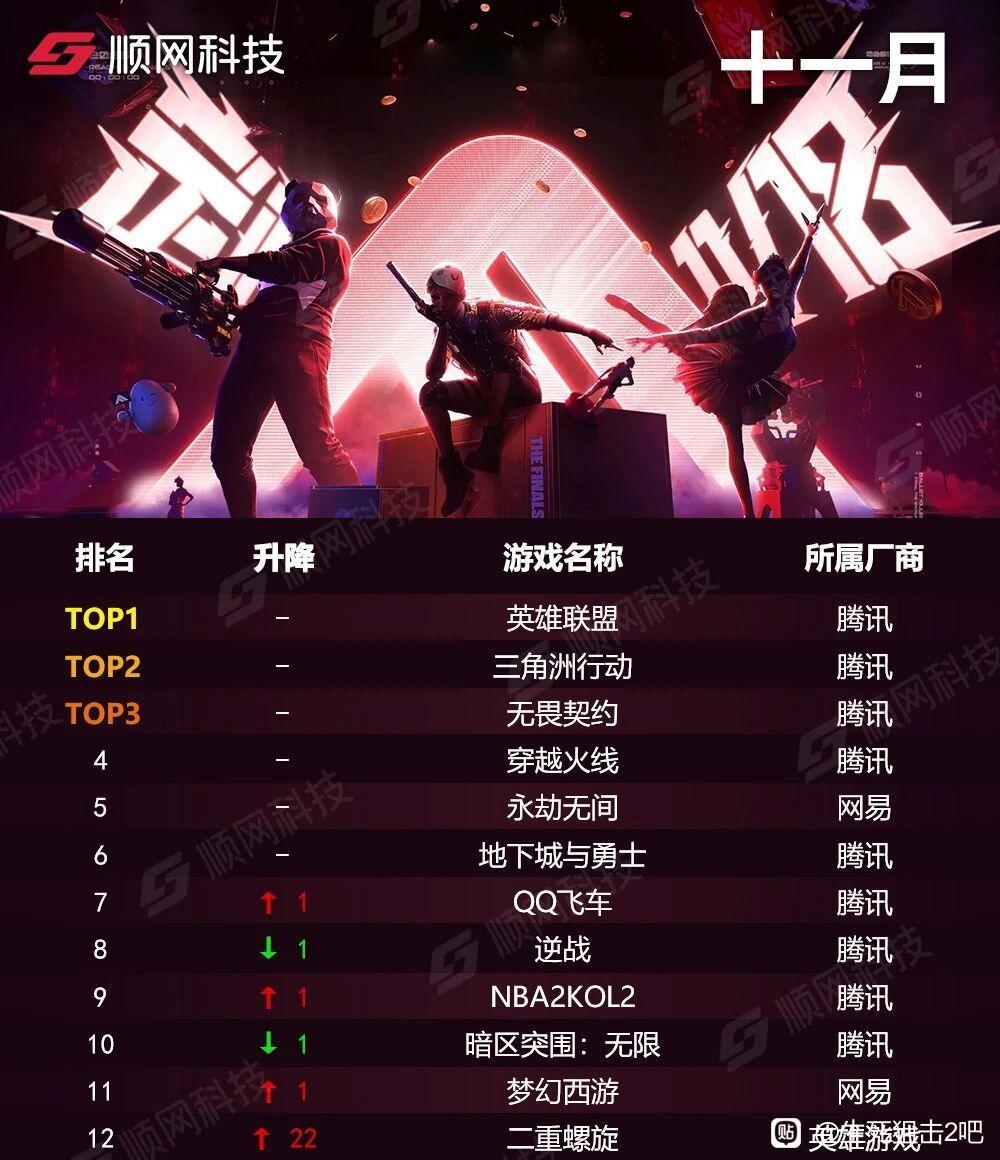 顺网科技11月网吧游戏热力榜曝光,腾讯9款游戏进入前十