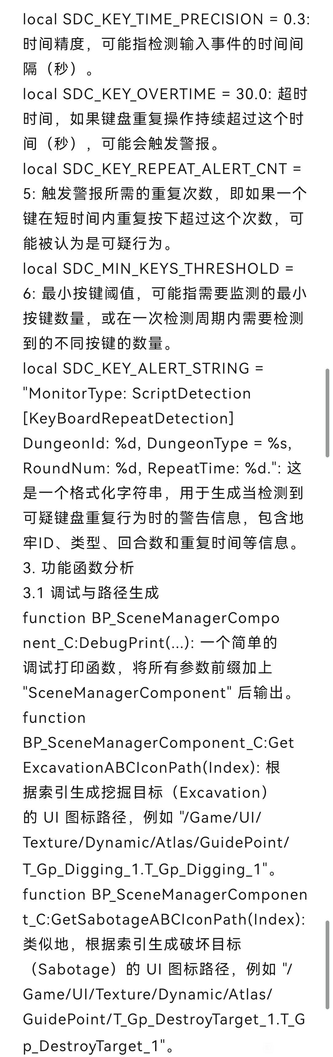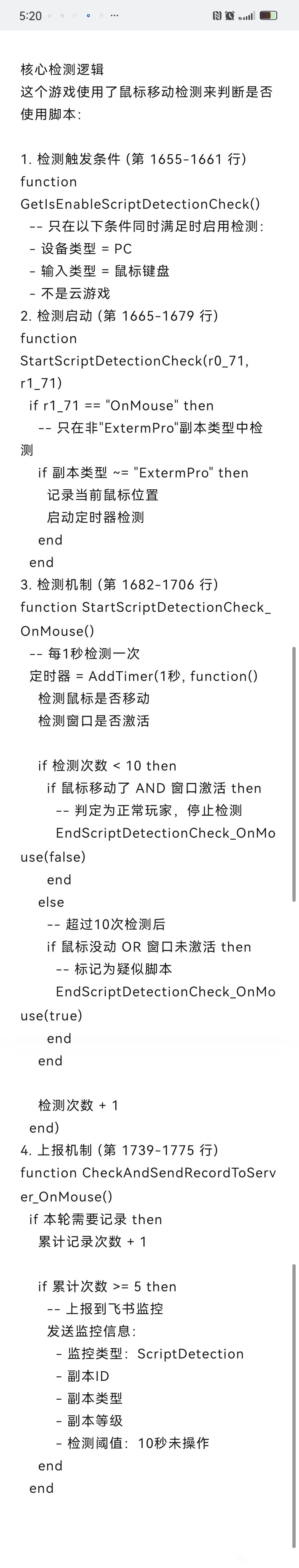 总结∶这两次的检测代码都可以说是弱智级别的,稍微复杂一点的脚本都检测不出来,检测逻辑也是正常人几乎不可能完成的操作∶连续50把副本一次没动过鼠标;30秒内复杂固定组合按键序列连续5次。被误封概率不为0,但极低。