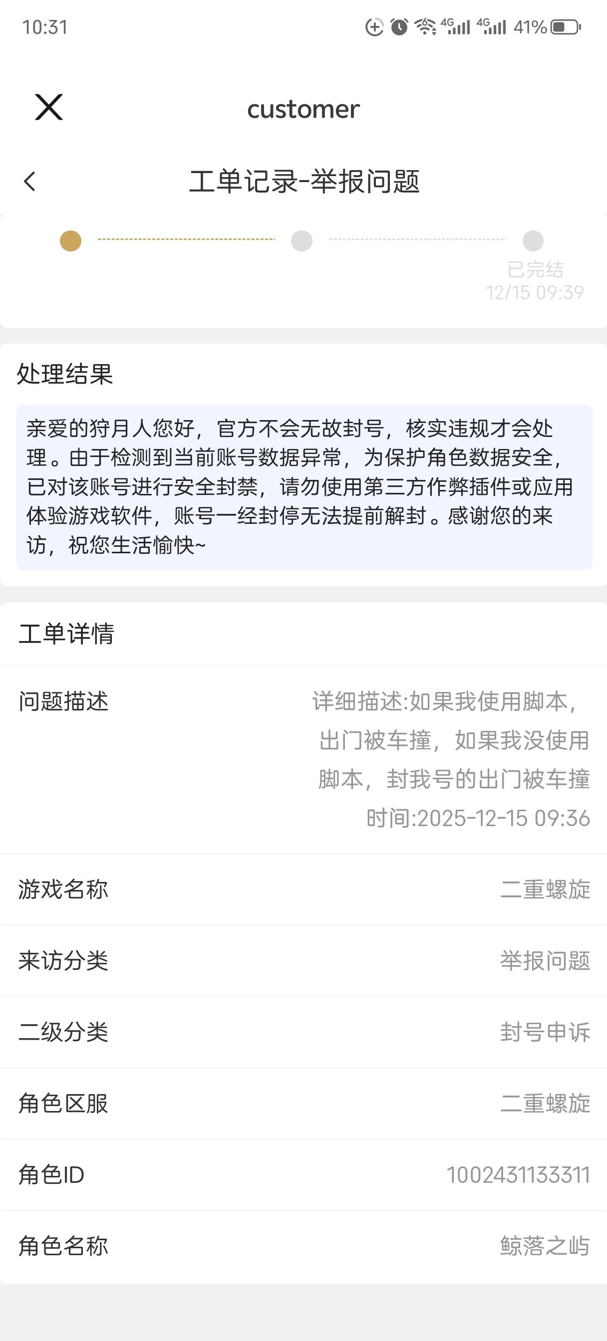 收到的回复全都好快,从昨天晚上十点开始,全是没几分钟就给你回复,全是自动回复,根本就不会检测你的账号的,我是不指望提前解封了,我就害怕后面挂机再给我来七天