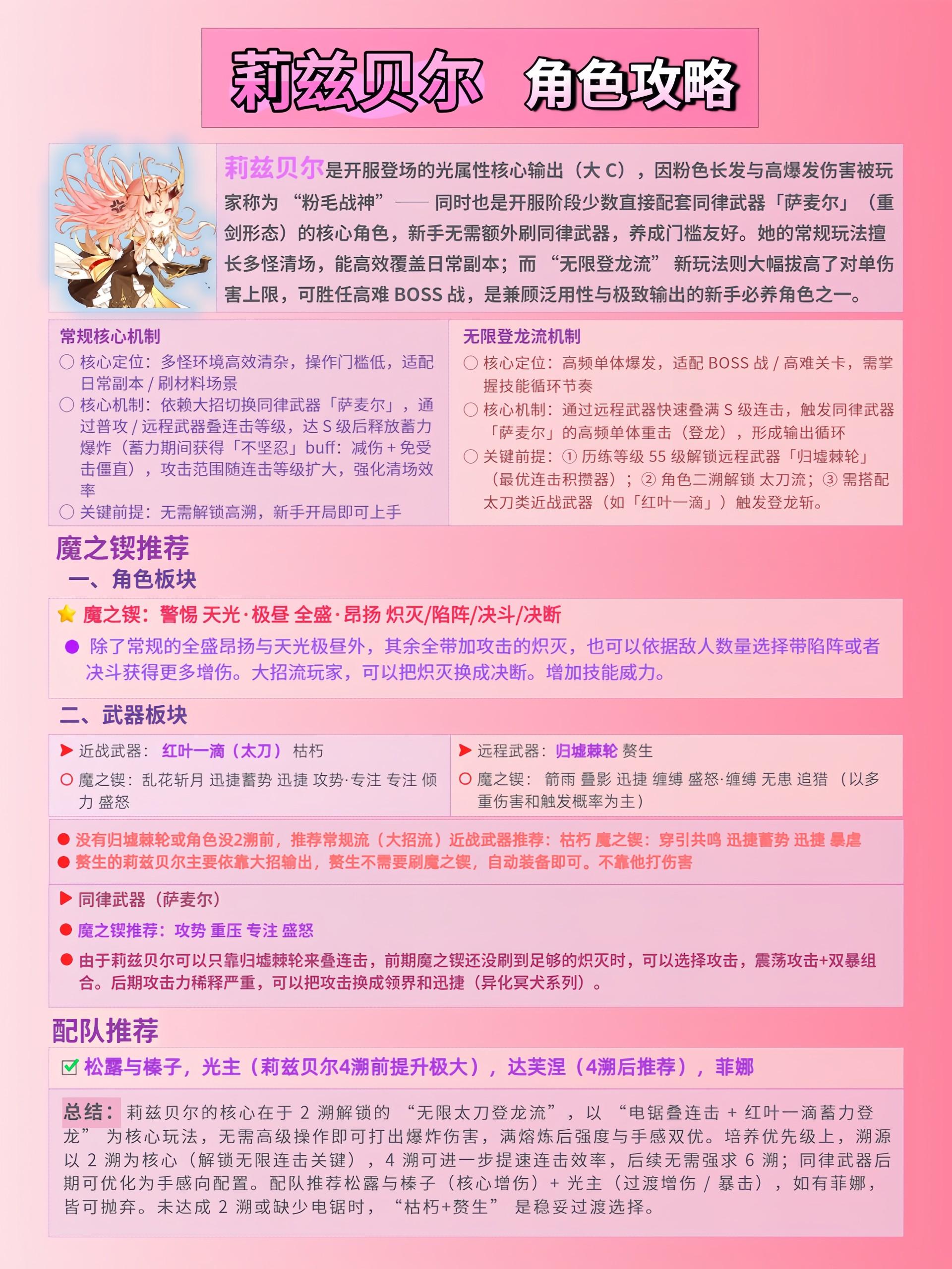 莉兹贝尔是开服登场的光属性核心输出(大 C),因粉色长发与高爆发伤害被玩家称为 “粉毛战神”—— 同时也是开服阶段少数直接配套同律武器「萨麦尔」(重剑形态)的核心角色,新手无需额外刷同律武器,养成门槛友好。她的常规玩法擅长多怪清场,能高效覆盖日常副本;而 “无限登龙流” 新玩法则大幅拔高了对单伤害上限,可胜任高难 BOSS 战,是兼顾泛用性与极致输出的新手必养角色之一。