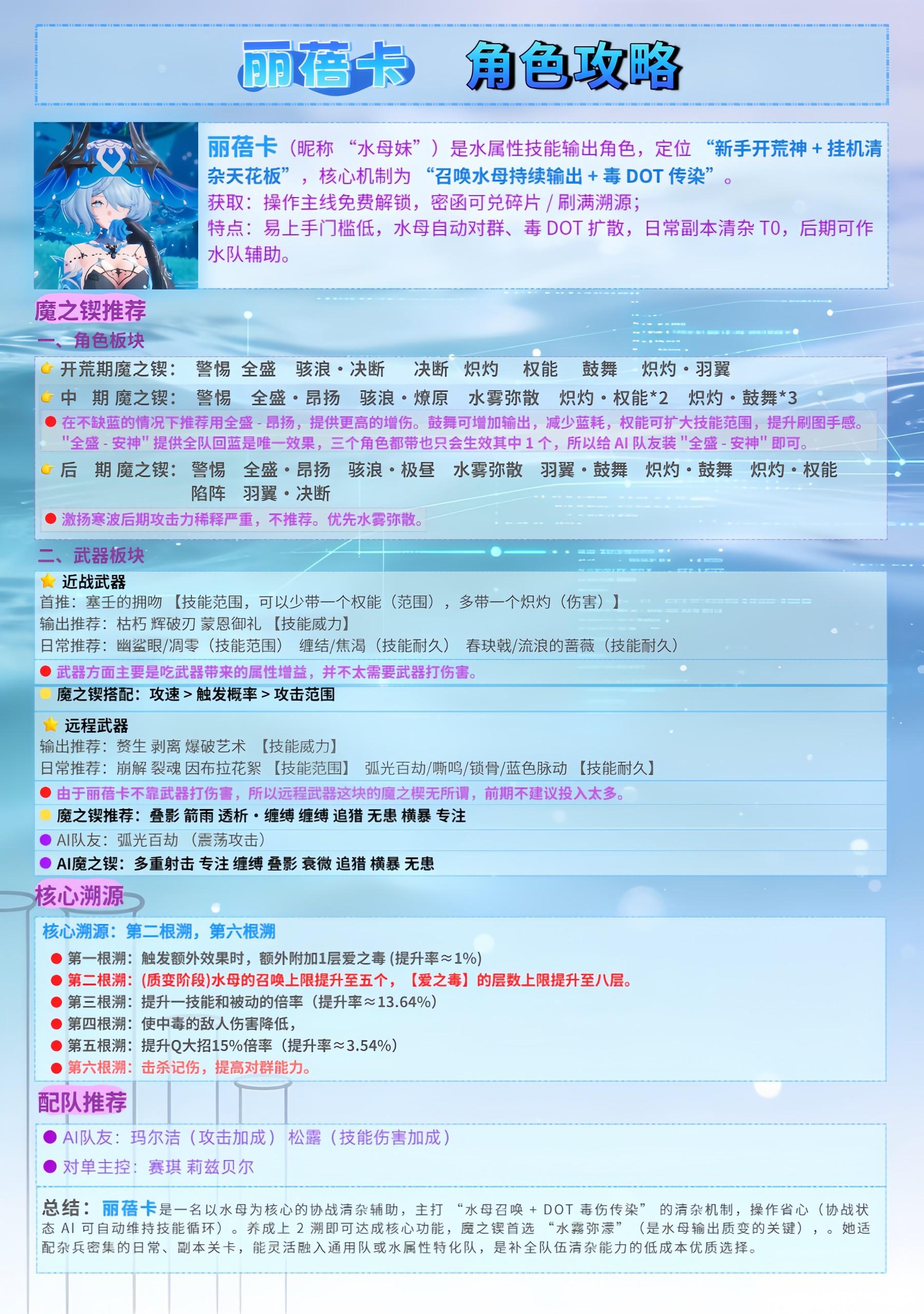 丽蓓卡是一名以水母为核心的协战清杂辅助,主打 “水母召唤 + DOT 毒伤传染” 的清杂机制,操作省心(协战状态 AI 可自动维持技能循环)。养成上 2 溯即可达成核心功能,魔之锲首选 “水霧弥濛”(是水母输出质变的关键),。她适配杂兵密集的日常、副本关卡,能灵活融入通用队或水属性特化队,是补全队伍清杂能力的低成本优质选择。