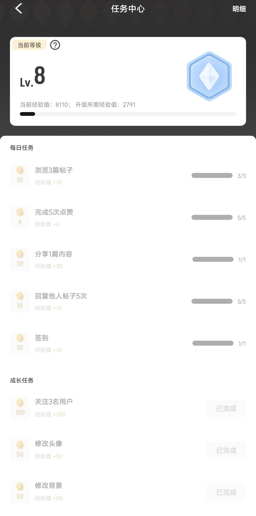 有一天每日经验任务只做了签到
