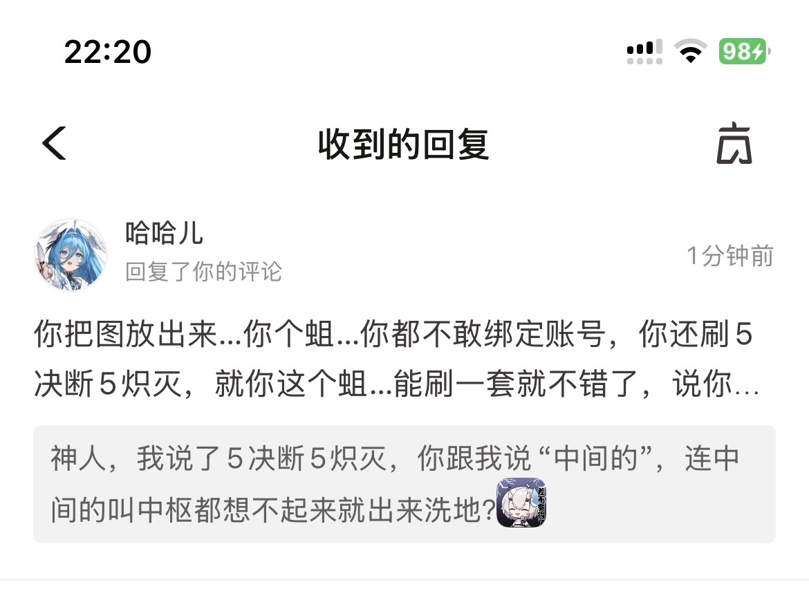 神人一个,能好好对线我也懒得挂他,主要是他这一手要图+秒拉黑我严重怀疑他打算两嘴一张就是编。不挂他我是真怕他给我猛造谣,哥们还是要点脸的
