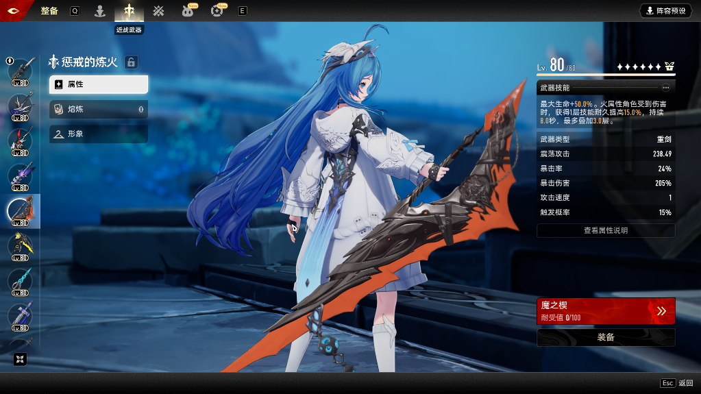 武器技能:+(50.0%/60.0%/70.0%/80.0%/90.0%/100.0%)最大生命。火属性角色受到伤害时,获得1层技能耐久提高(15.0%/18.0%/21.0%/24.0%/27.0%/30.0%),持续8.0秒,最多叠加3.0层