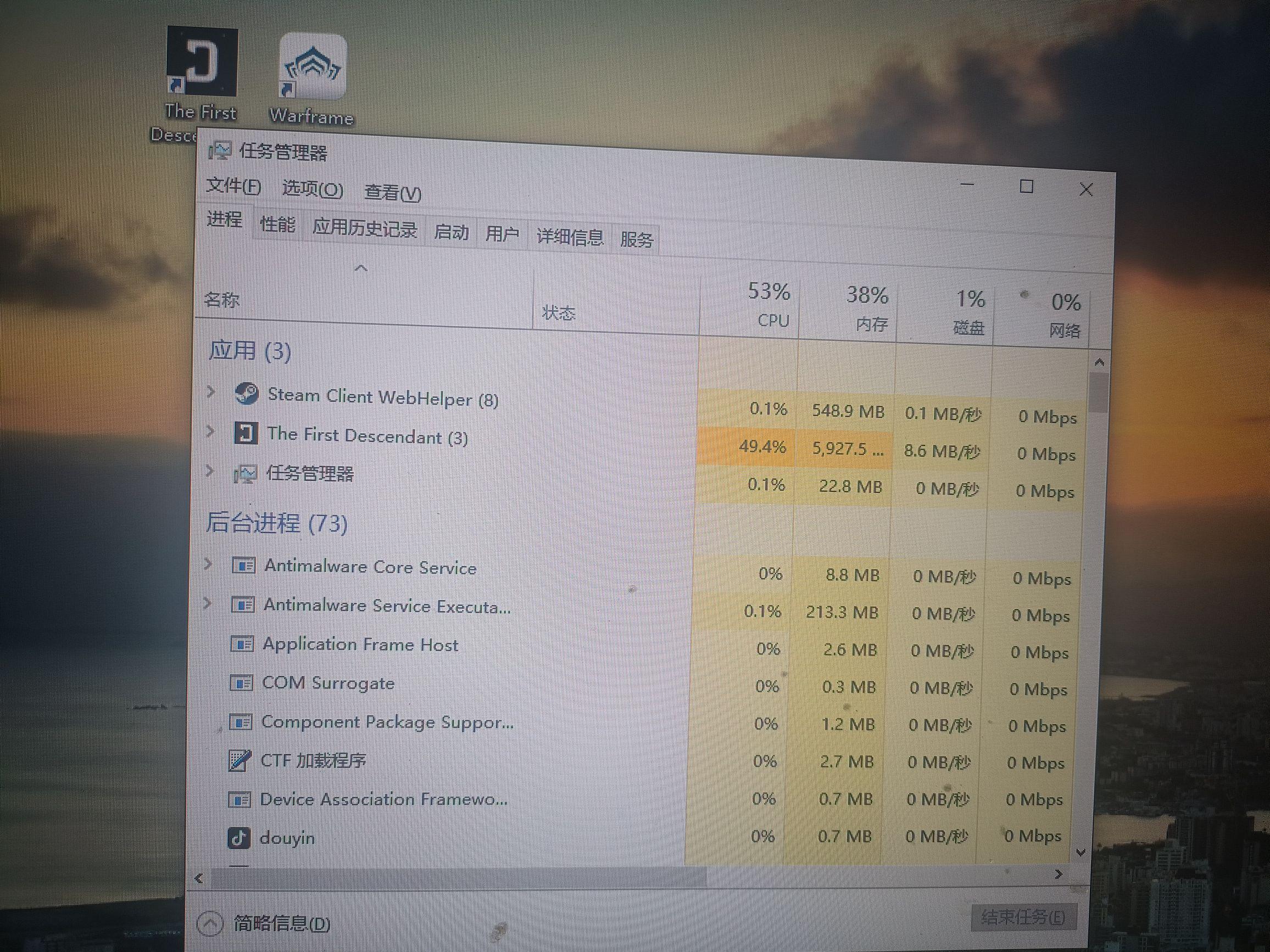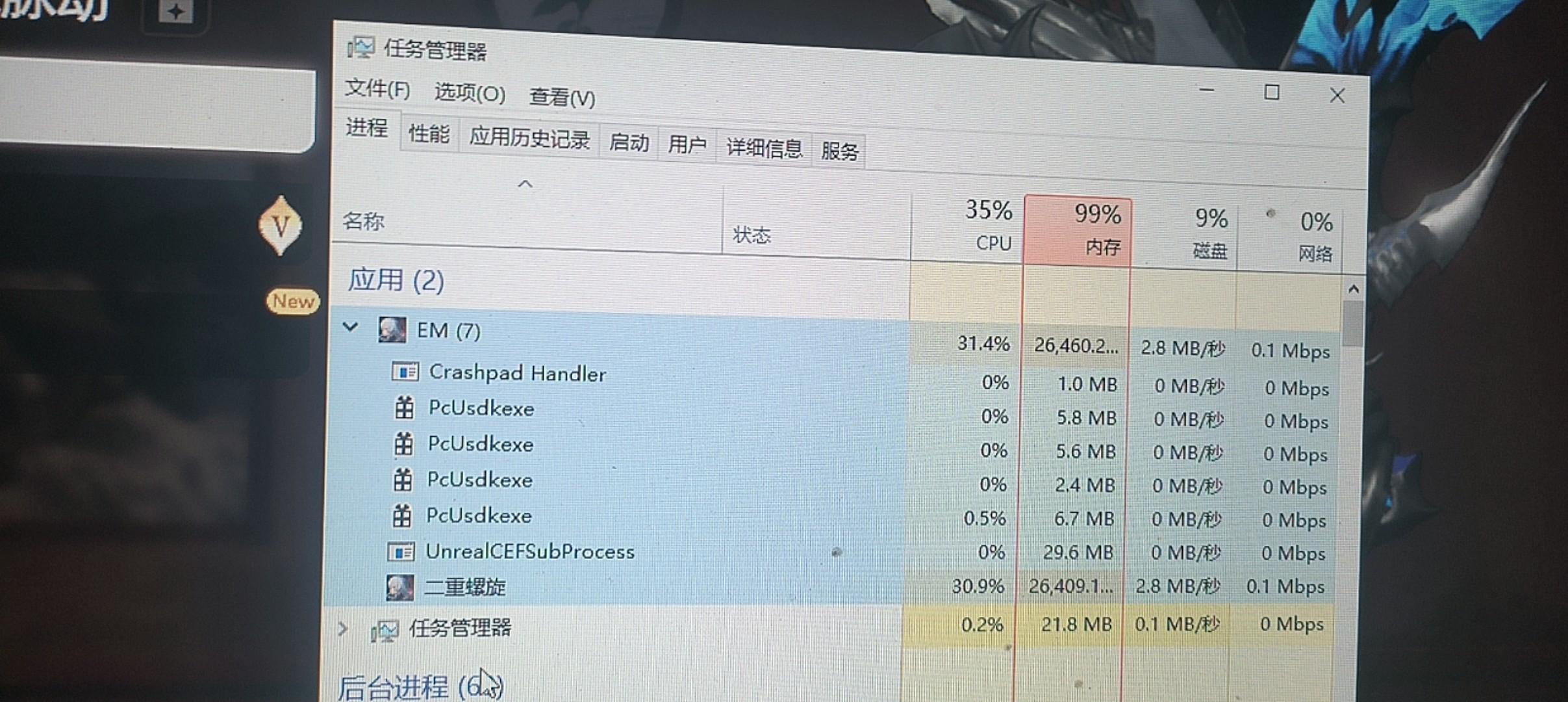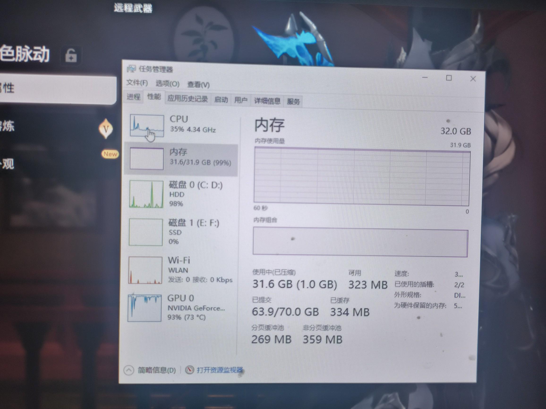 昨天还好好的,今天早上上游戏有个更新进去卡成PPT了,一看管理器内存给我吃满了