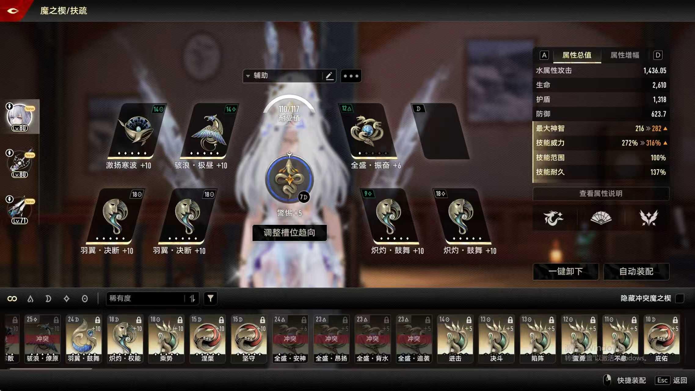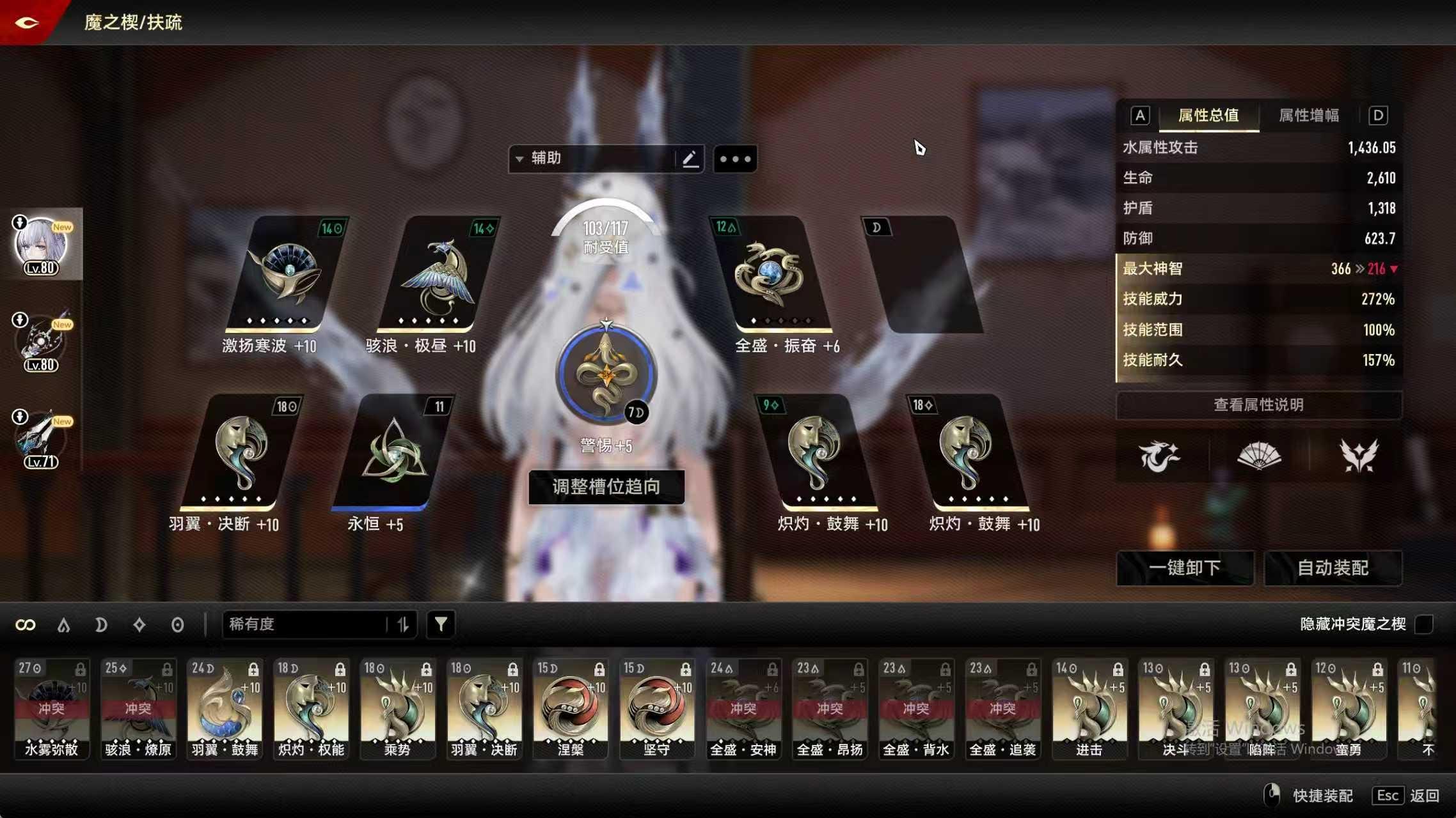 激扬寒波和狮鹫极昼必带,百首推荐带振奋(给另一个辅助带安神,另一个单独出场时也有蓝用,扶疏单c辅助时也有振奋增伤)。