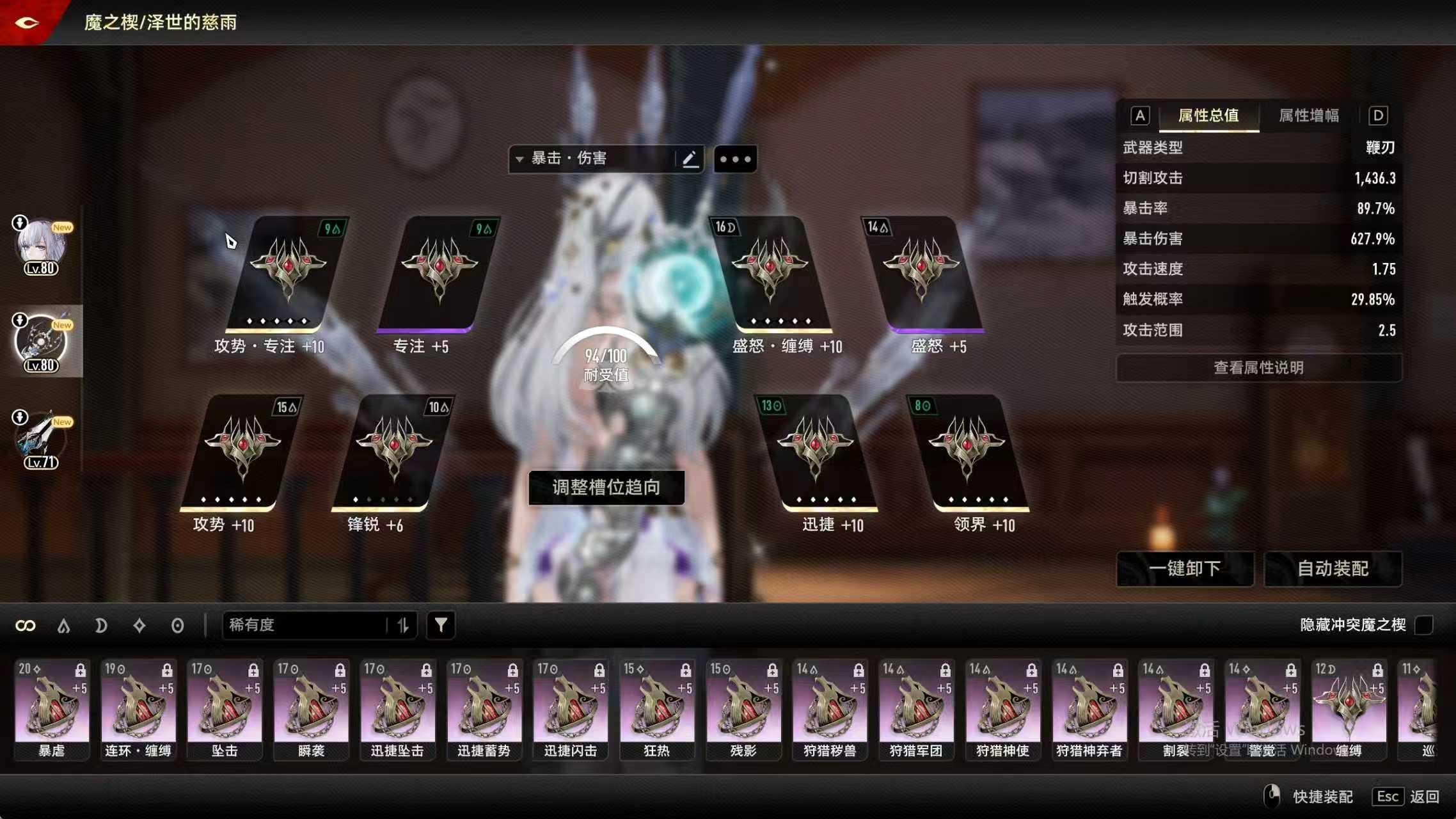 专武魔之楔可选择较少,攻势·专注,专注,迅捷,领界必带,剩下堆伤害魔之楔就可以。