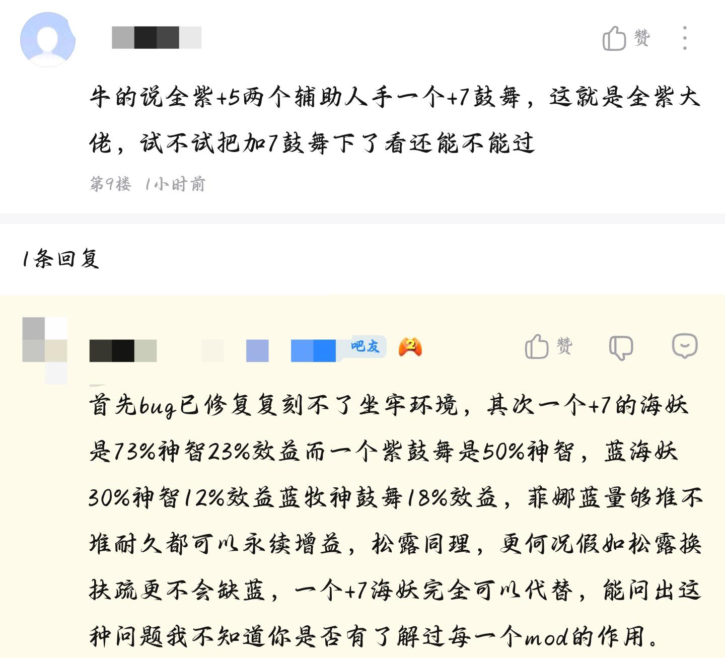 恶意的否定他人劳动成功纯恶心。要是加7全盛那能影响输出伤害。鼓舞这一定影响都没有的。毕竟深渊12难度打不死人,换点其他蓝色技能效益也和鼓舞7没区别了