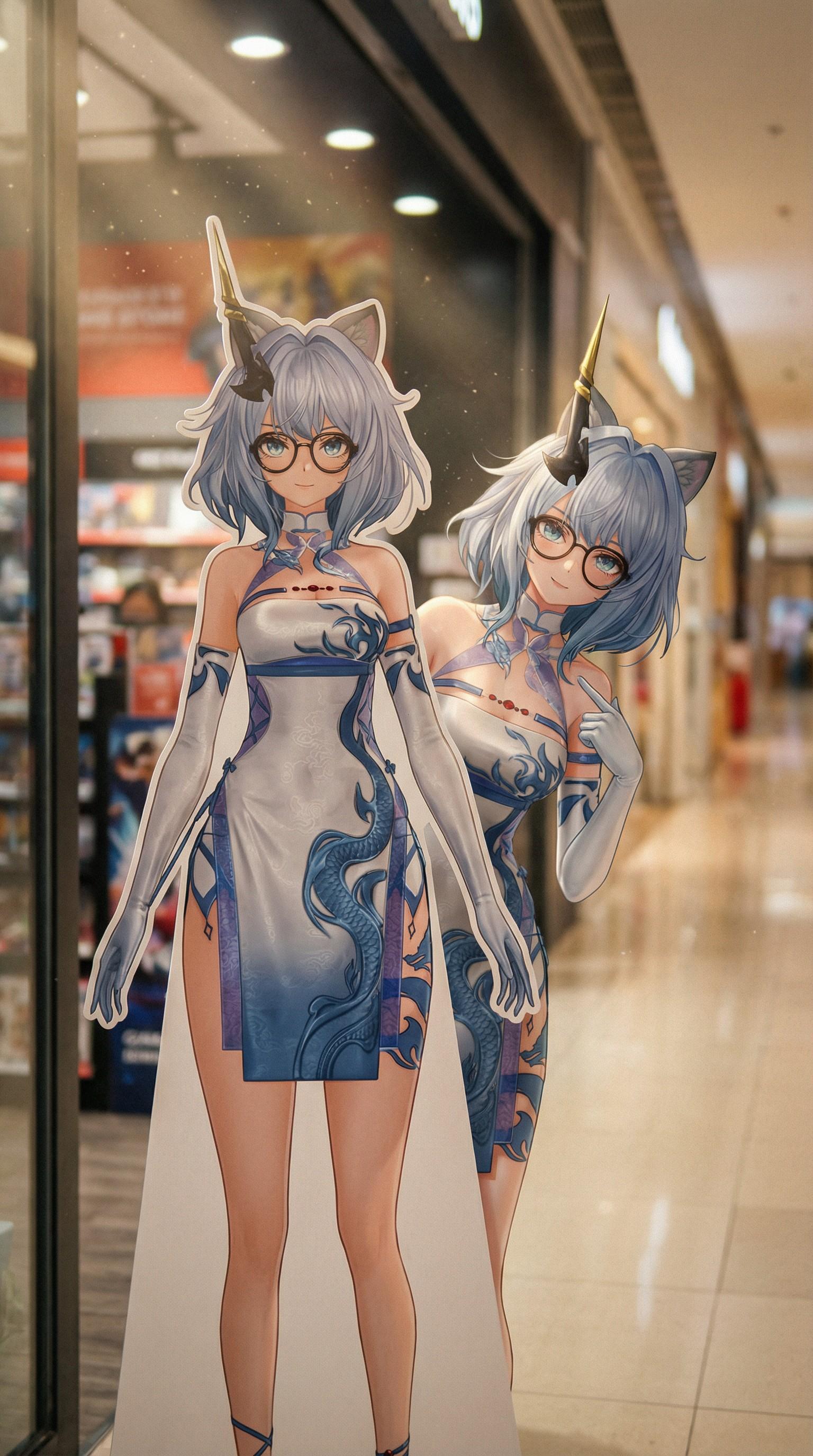 绘制图中角色的立绘等身立牌,放置在购物中心的一家游戏周边(谷子)店门口。背景虚化处理。 绘制图中角色从立牌后轻微向右探出身,歪着头一只手指向自己,展现亲密感。图中角色画风保持不变,仿佛穿越到现实,确保光影效果,让图中的动漫画风少女能够完美的和写实背景融合 注意:背景,包括立牌是写实画风,拍摄视角大光圈带来的浅景深将背景虚化,使观众的视线牢牢和她的眼神交流。 胶片颗粒感: 后期模拟 胶片质感,增加画面的厚重感和颗粒噪点,去除数码味的生硬。电影感、叙事性、私密感、高动态范围。空气中要有轻微的丁达尔效应(体积光),表现出室内的尘埃感和温馨的雾气感,不要出现类似(谷子店)等商店名称,模糊处理 重点,立牌和背后的人物虽然是一个(图一),但是画风不同,前面的是立牌,后面的是动漫画风少女,注意两者区别不要混淆,请仔细检查这一点