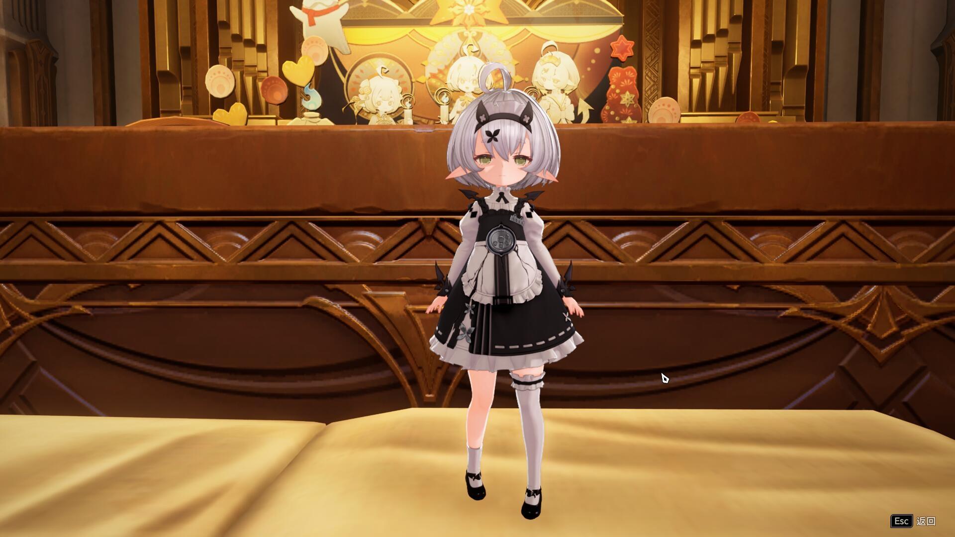 侍者皎皎,目前唯一一个眼睛是绿色的皎皎,头上带着恶魔角的发饰,背后有个剪头样式的尾巴饰品,腿环,一长一短的袜子,平时看起来没什么精神,三无小恶魔女仆,这个我是真喜欢,直接给到夯中夯
