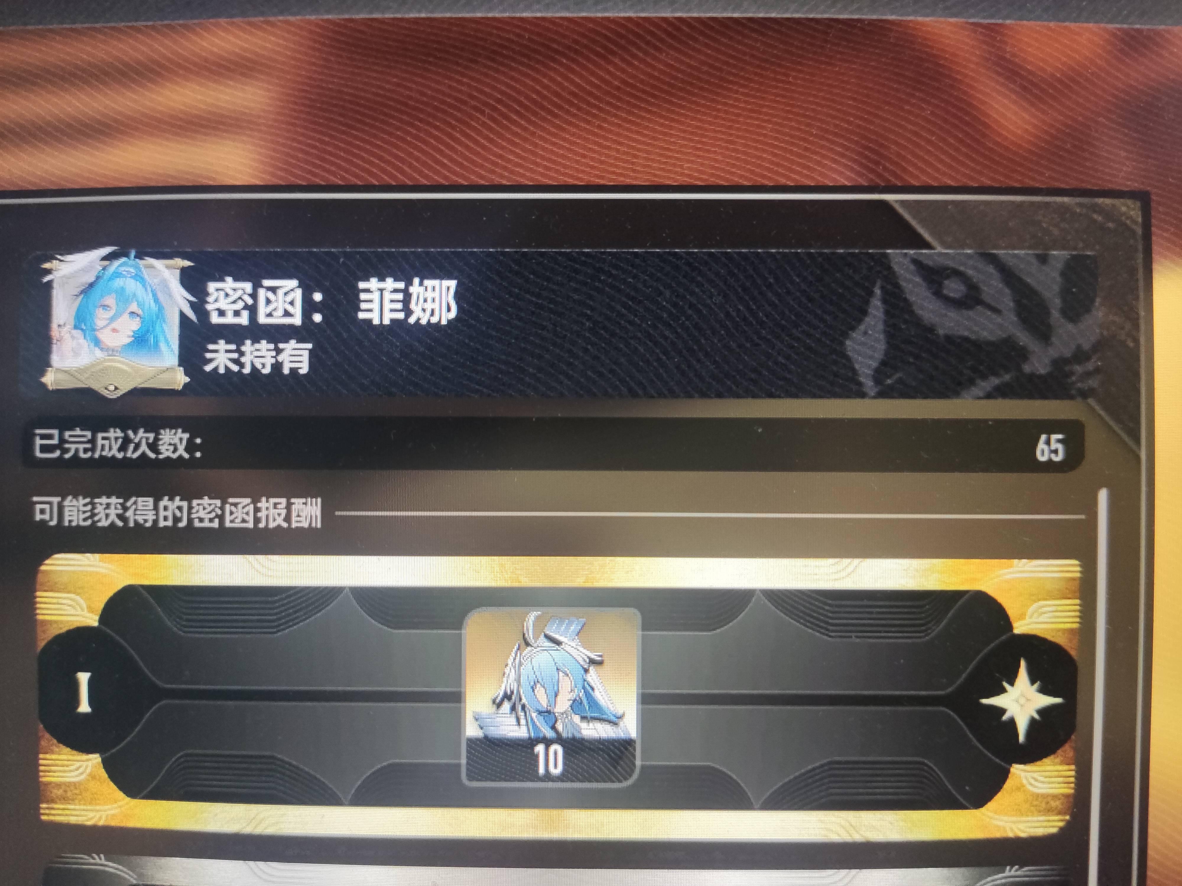 菲娜爱我,我爱菲娜,刚刚才把上次深渊的65张密函刷了,比赛琪好多了,直接二溯过半,刷一次探索出了两个金,赛琪当时65张密函才一溯过一点