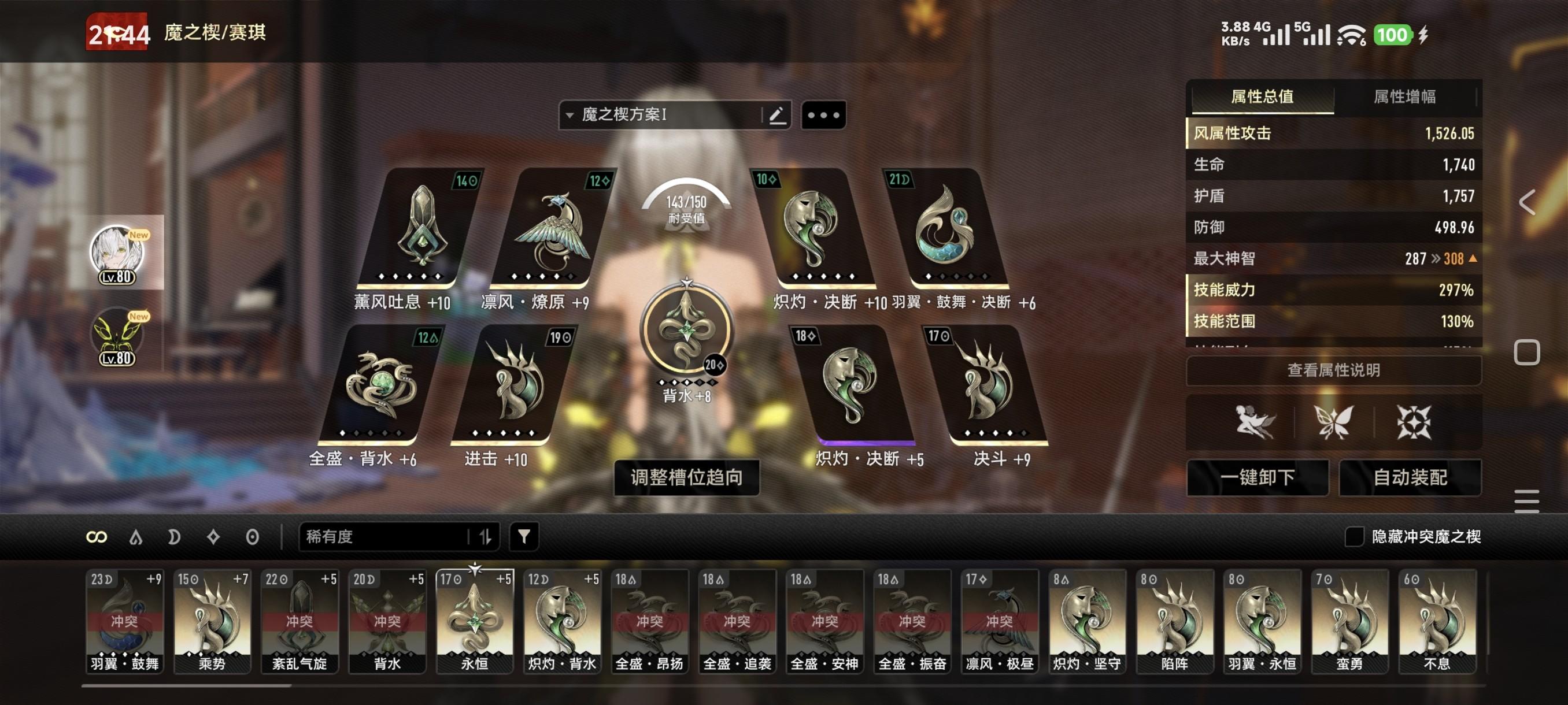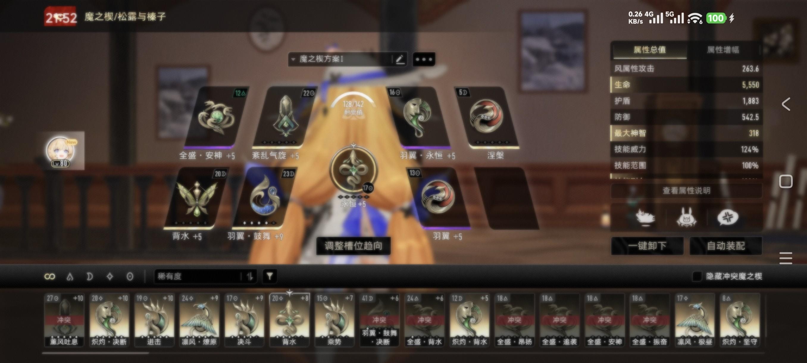 赛琪说完了就到松露了,为什么我在标题说可能不需要那么多的羽翼鼓舞,首先作为辅助角色,魔之楔占用率没有输出角色那么高(8个格子精打细算,想办法输出最大化)。那么我们其实可以不使用羽翼鼓舞背水,改成焕生灵背水+羽翼鼓舞+羽翼。如图