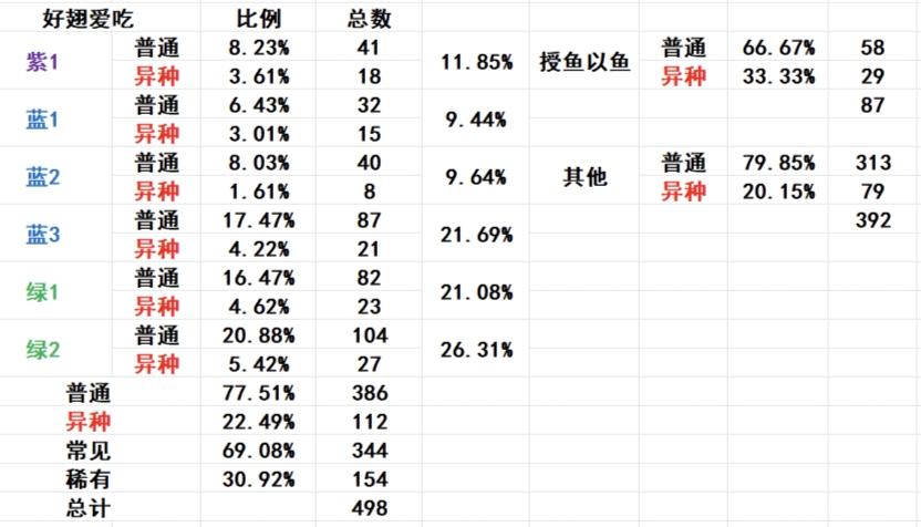 注5:异种鱼授鱼以鱼必得异种鱼,普通鱼授鱼以鱼会再触发一次异种判定,概率低于第一次判定