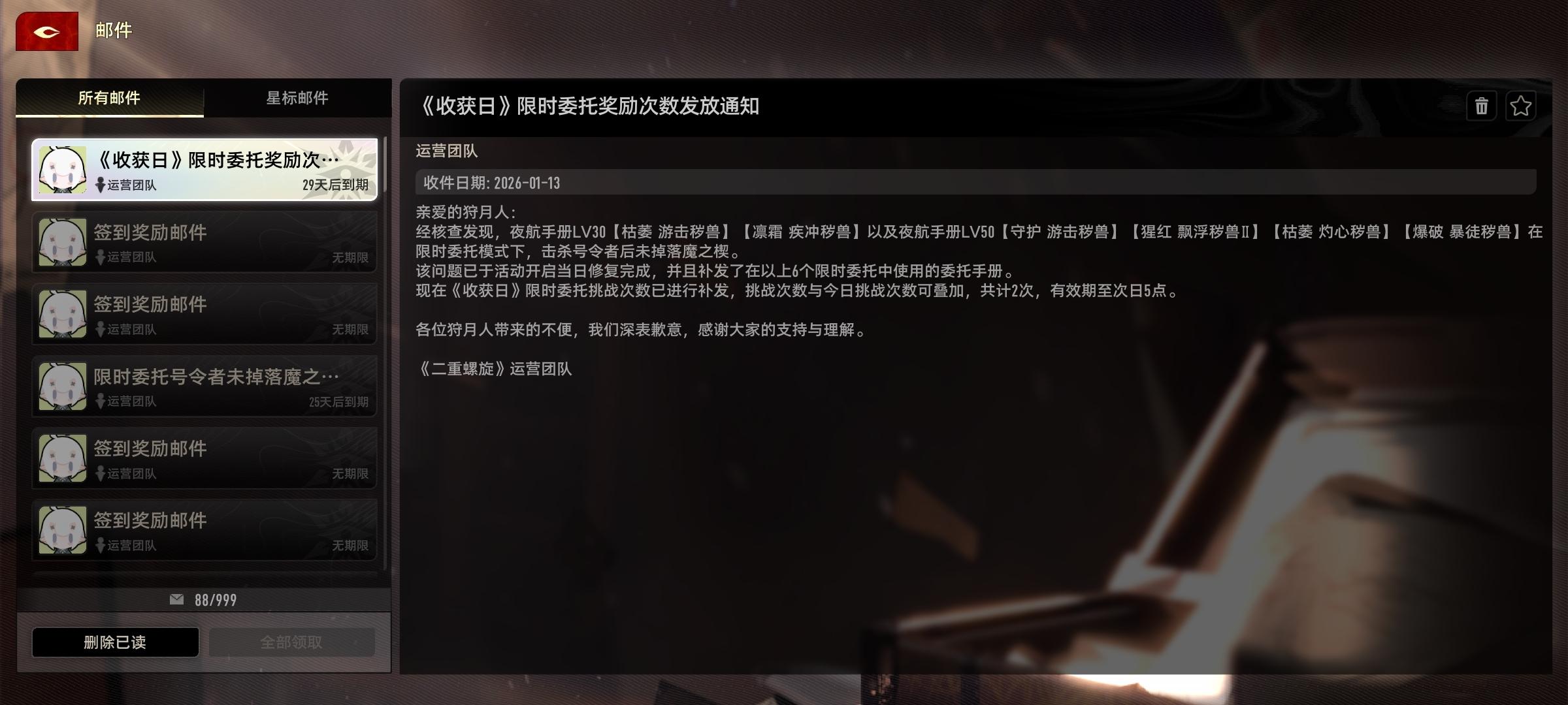 下午都没看到。晚上才收到。发的好晚啊!我差点错过。也不在每天重置时发。明早5点就没了。明天肯定受损玩家会骂的。