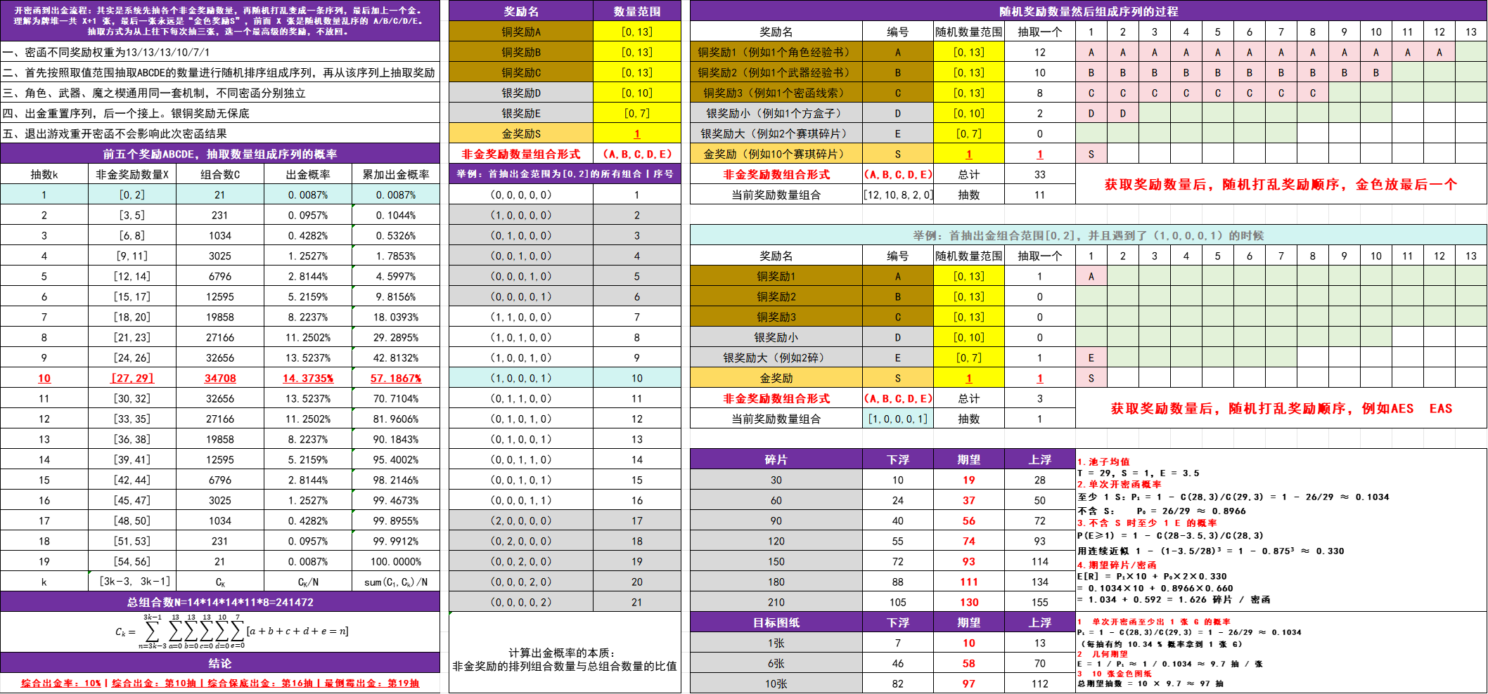 其实是系统先抽各个非金奖励数量,再随机打乱变成一条序列,最后加上一个金。理解为牌堆一共 X+1 张,最后一张永远是“金色奖励S”,前面 X 张是随机数量乱序的 A/B/C/D/E。抽取方式为从上往下每次抽三张,选一个最高级的奖励,不放回。