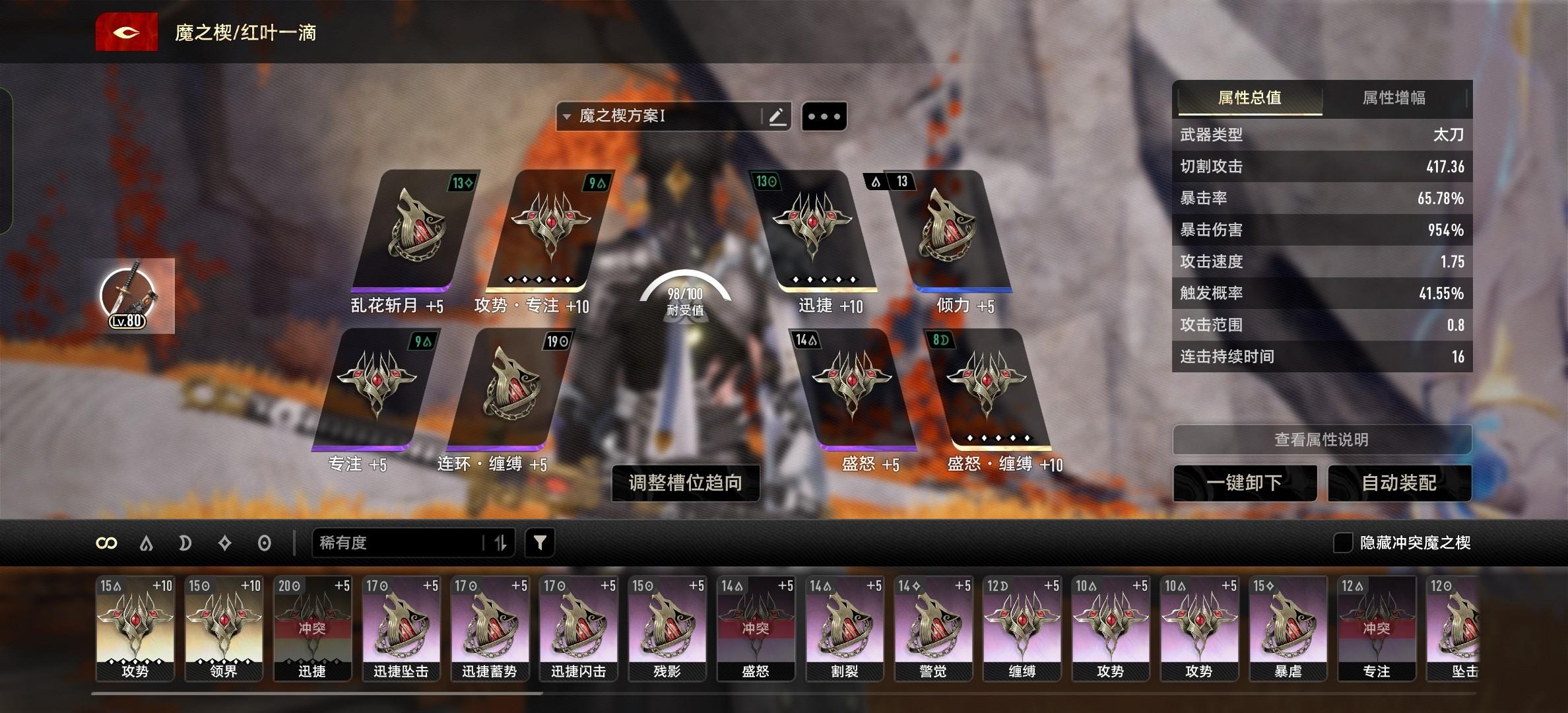 前言,刻舟开大后不吃武器额外效果,只吃主属性加成,比如红叶一滴武器词条是加爆伤和根据连击等级给增伤,只吃直接加到面板上的爆伤,而增伤不吃,即不吃武器后续上的buff,MOD也是同理,不吃后续buff,倾力这类就用不了。总之就是刻舟开大后只吃武器的面板,架势卡(也就是特殊紫色MOD)的改变招式也不会生效,但是加的面板属性生效。