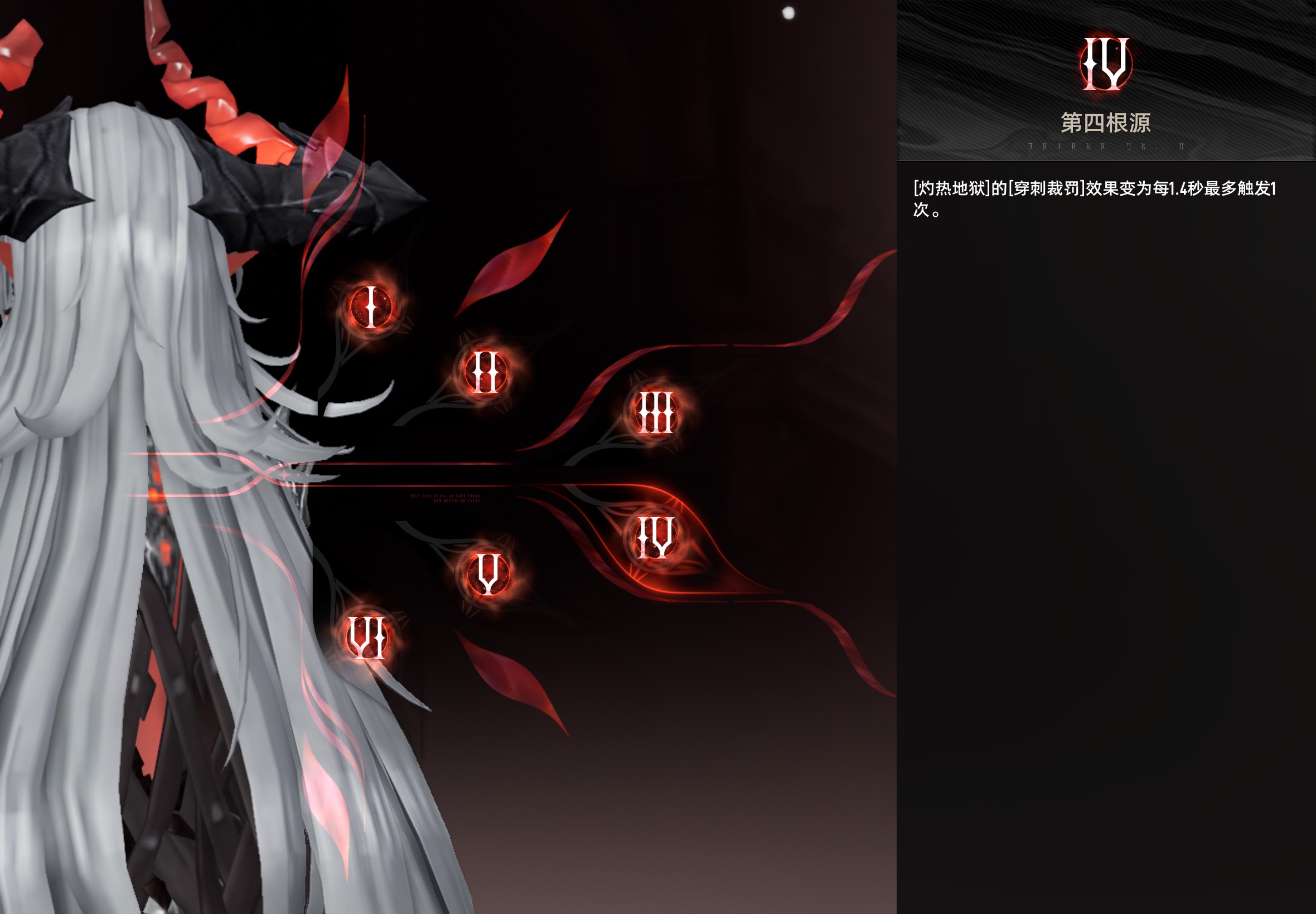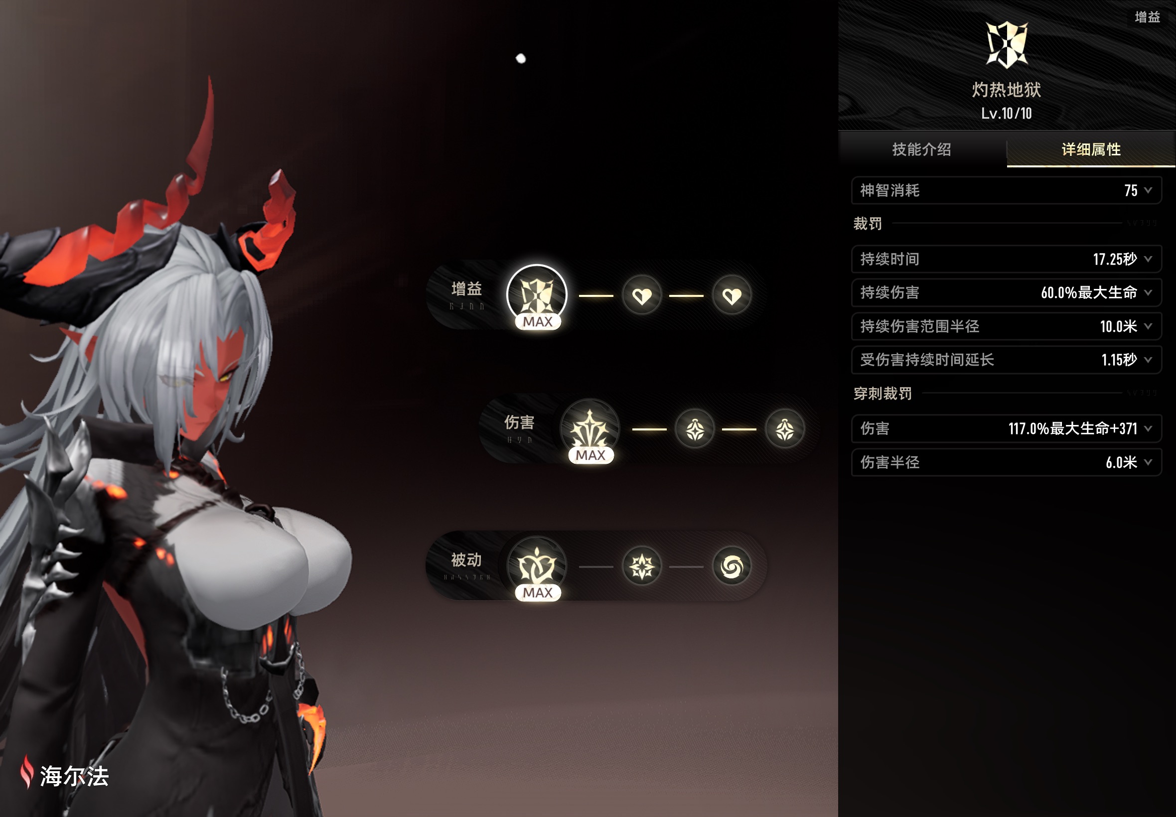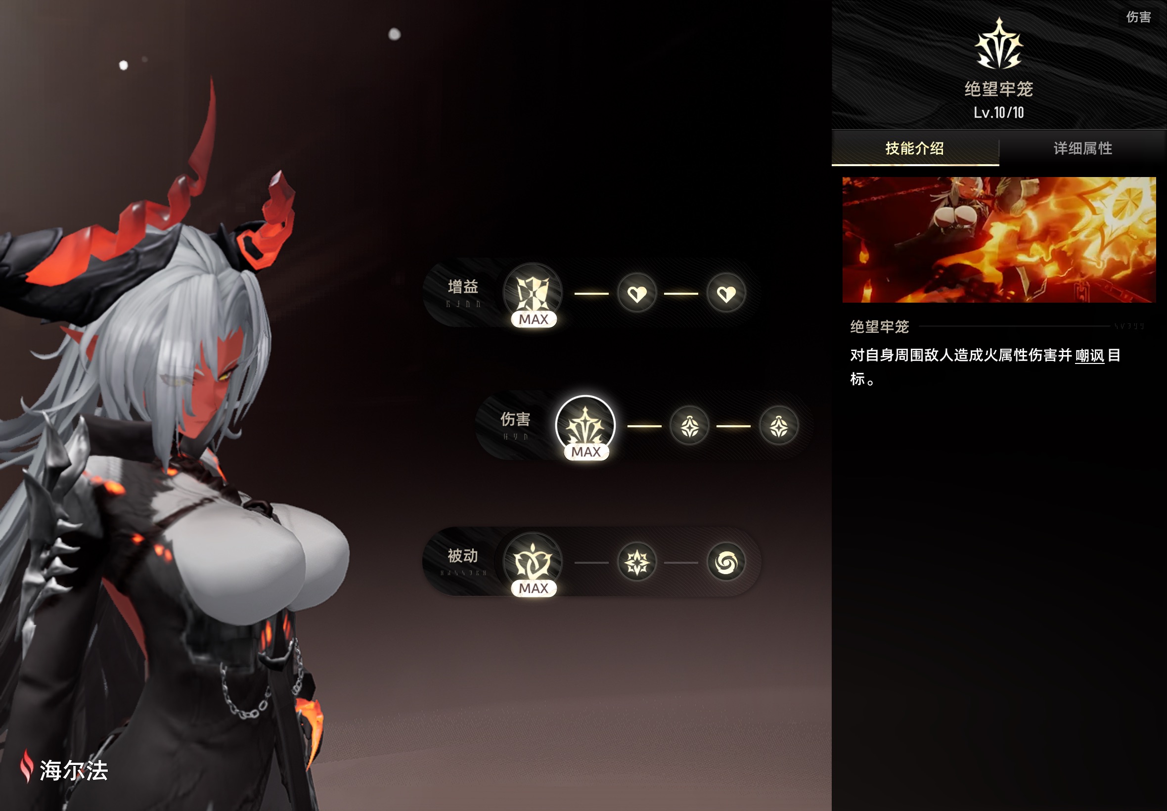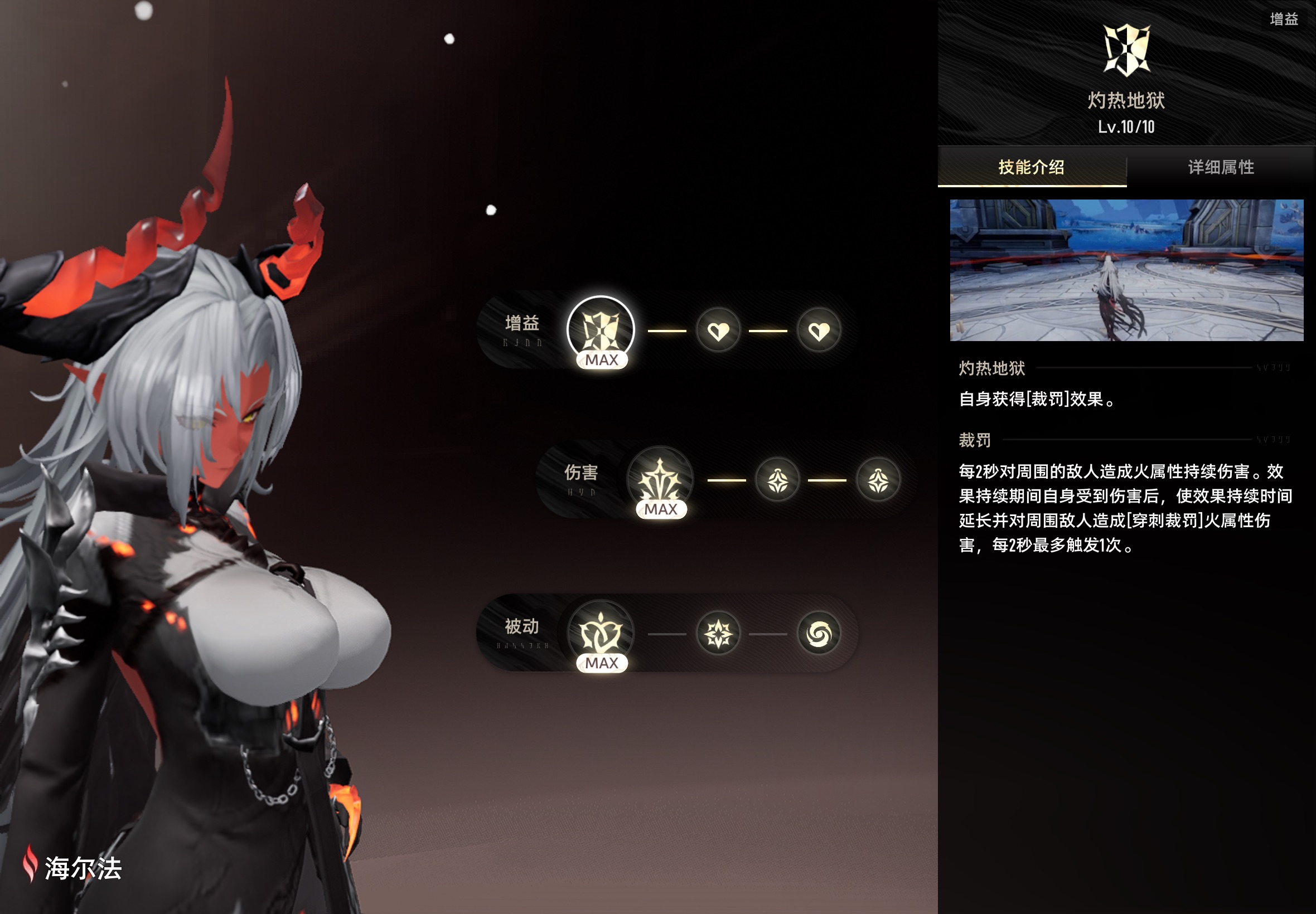 裁罚:自身获得霸体效果。每2秒对周围的敌人造成火属性伤害,受到伤害的敌人将被附加「焚身」印记,携带「焚身」印记的敌人造成伤害降低。效果持续期间自身受到伤害后,使效果持续时间延长并对周围敌人造成「穿刺裁罚」火属性伤害,每2秒最多触发一次。携带「焚身」印记的敌人受到「穿刺裁罚」伤害时,海尔法在敌人脚下释放「审判火柱」,造成火属性范围伤害,每2秒最多触发5次,「审判火柱」命中无护盾敌人时额外增加伤害。